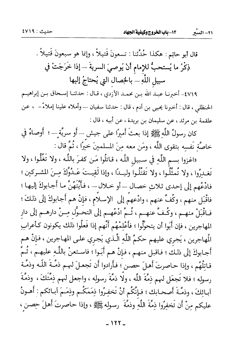اغْزُوا بِسْمِ اللَّهِ فِي سَبِيلِ اللَّهِ قَاتِلُوا مَنْ كَفَرَ بِاللَّهِ وَلَا تَغُلُّوا وَلَا تَغْدِرُوا وَلَا تُمَثِّلُوا وَلَا تَقْتُلُوا وَلِيدًا وَإِذَا لَقِيتَ عَدُوَّكَ مِنَ الْمُشْرِكِينَ فَادْعُهُمْ إِلَى إِحْدَى ثَلَاثِ خِصَالٍ ـ أَوْ خِلَالٍ ـ فأَيَّتَهُنَّ مَا أَجَابُوكَ إِلَيْهَا فَاقْبَلْ مِنْهُمْ وكُفَّ عَنْهُمُ ادْعُهُمْ إِلَى الْإِسْلَامِ فَإِنْ هُمْ أَجَابُوكَ إِلَى ذَلِكَ فَاقْبَلْ مِنْهُمْ وَكُفَّ عَنْهُمْ ثُمَّ ادْعُهُمْ إِلَى التحوُّلِ مِنْ دَارِهِمْ إِلَى دَارِ الْمُهَاجِرِينَ فَإِنْ أَبَوا أَنْ يتحوَّلُوا فأَعْلِمْهُم أَنَّهُمْ إِذَا فَعَلُوا ذَلِكَ يَكُونُونَ كَأَعْرَابِ الْمُهَاجِرِينَ يَجْرِي عَلَيْهِمْ حُكْمُ اللَّهِ الَّذِي يَجْرِي عَلَى الْمُهَاجِرِينَ فَإِنْ هُمْ أَجَابُوكَ إِلَى ذَلِكَ فَاقْبَلْ مِنْهُمْ فَإِنْ هُمْ أَبَوْا فَاسْتَعِنْ بِاللَّهِ عَلَيْهِمْ ثم قاتلهم وإذا حاصرت أهل حصن فأرادوا أَنْ تَجْعَلَ لَهُمْ ذِمَّةَ اللَّهِ وَذِمَّةَ رَسُولِهِ فَلَا تَجْعَلْ لَهُمْ ذِمَّةَ اللَّهِ وَلَا ذِمَّةَ رَسُولِهِ وَاجْعَلْ لَهُمْ ذِمَّتَكَ وَذِمَّةَ آبَائِكَ وَذِمَّةَ أَصْحَابِكَ فَإِنَّكُمْ إِنْ تَخفِروا ذِمَمَكُمْ وَذِمَمَ آبَائِكُمْ أهونُ عَلَيْكُمْ مِنْ أَنْ تُخْفِرُوا ذِمَّةَ اللَّهِ وَذِمَّةَ رَسُولِهِ صَلَّى اللَّهُ عَلَيْهِ وَسَلَّمَ وَإِذَا حاصرت أهل حصن -[123]- فأرادوا ن تُنزِلُوهُم عَلَى حُكْمِ اللَّهِ فَلَا تُنْزِلُوهُمْ عَلَى حُكْمِ اللَّهِ فَإِنَّكُمْ لَا تَدْرُونَ أَتُصِيبُونَ حُكْمَ اللَّهِ فِيهِمْ أَمْ لَا؟ )