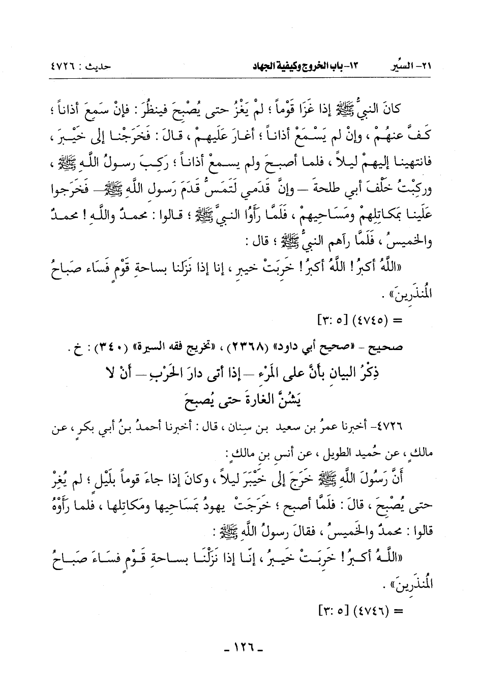 أَنَّ رسول الله صلى الله عليه وسلم خَرَجَ إِلَى خَيْبَرَ لَيْلًا وَكَانَ إِذَا جَاءَ قَوْمًا بِلَيْلٍ لَمْ يُغِرْ حَتَّى يُصْبِحَ قَالَ: فلمَّا أَصْبَحَ خَرَجَتْ يَهُودُ بِمَسَاحِيهَا وَمَكَاتِلِهَا فَلَمَّا رَأَوْهُ قَالُوا: مُحَمَّدٌ وَالْخَمِيسُ فَقَالَ رَسُولُ اللَّهِ صَلَّى اللَّهُ عَلَيْهِ وَسَلَّمَ: