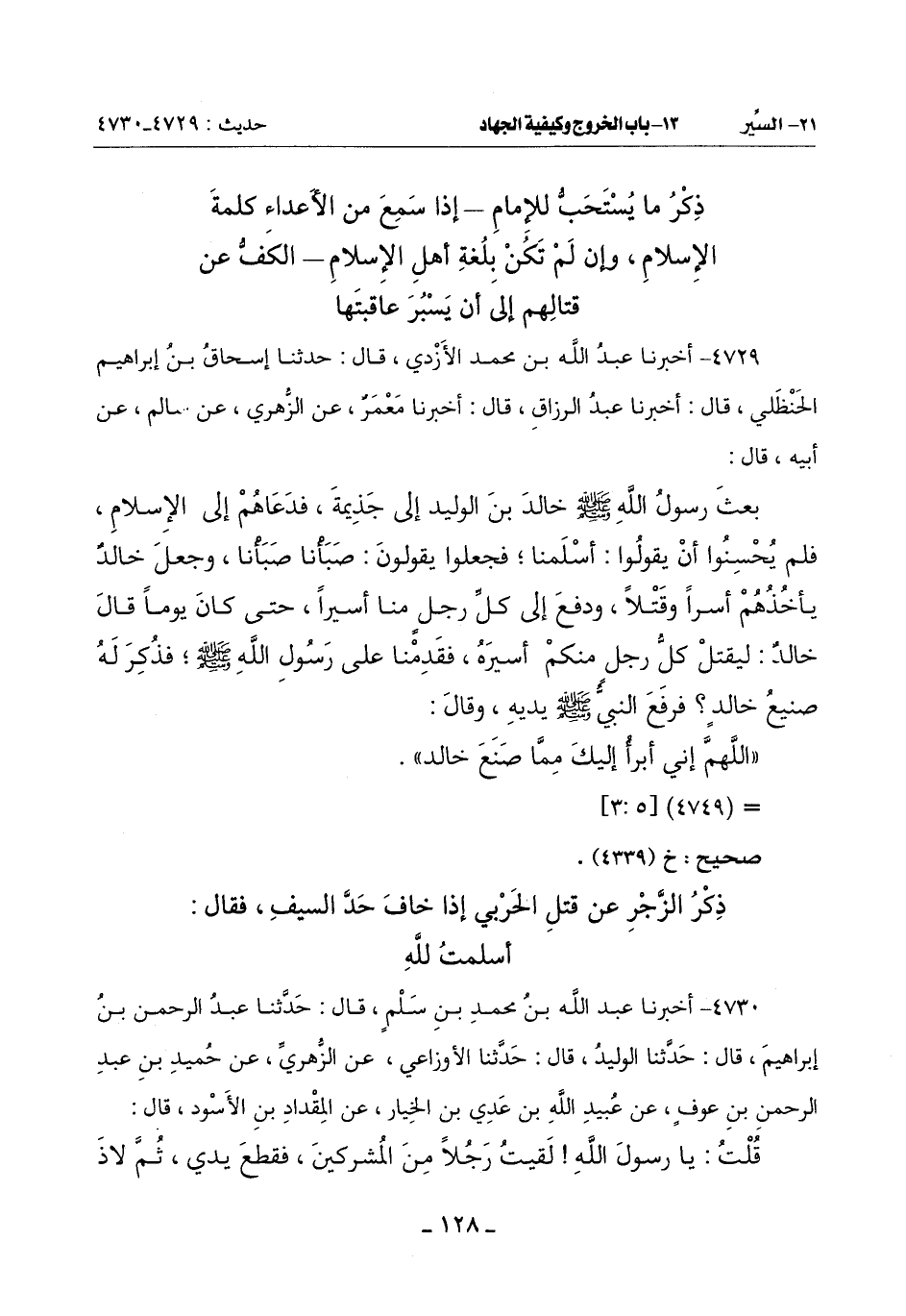 ذِكْرُ مَا يُسْتَحَبُّ لِلْإِمَامِ ـ إِذَا سَمِعَ مِنَ الْأَعْدَاءِ كَلِمَةَ الْإِسْلَامِ وَإِنْ لَمْ تَكُنْ بِلُغةِ أَهْلِ الْإِسْلَامِ ـ الْكَفُّ عَنْ قِتَالِهِمْ إِلَى أَنْ يَسْبُرَ عاقبتها