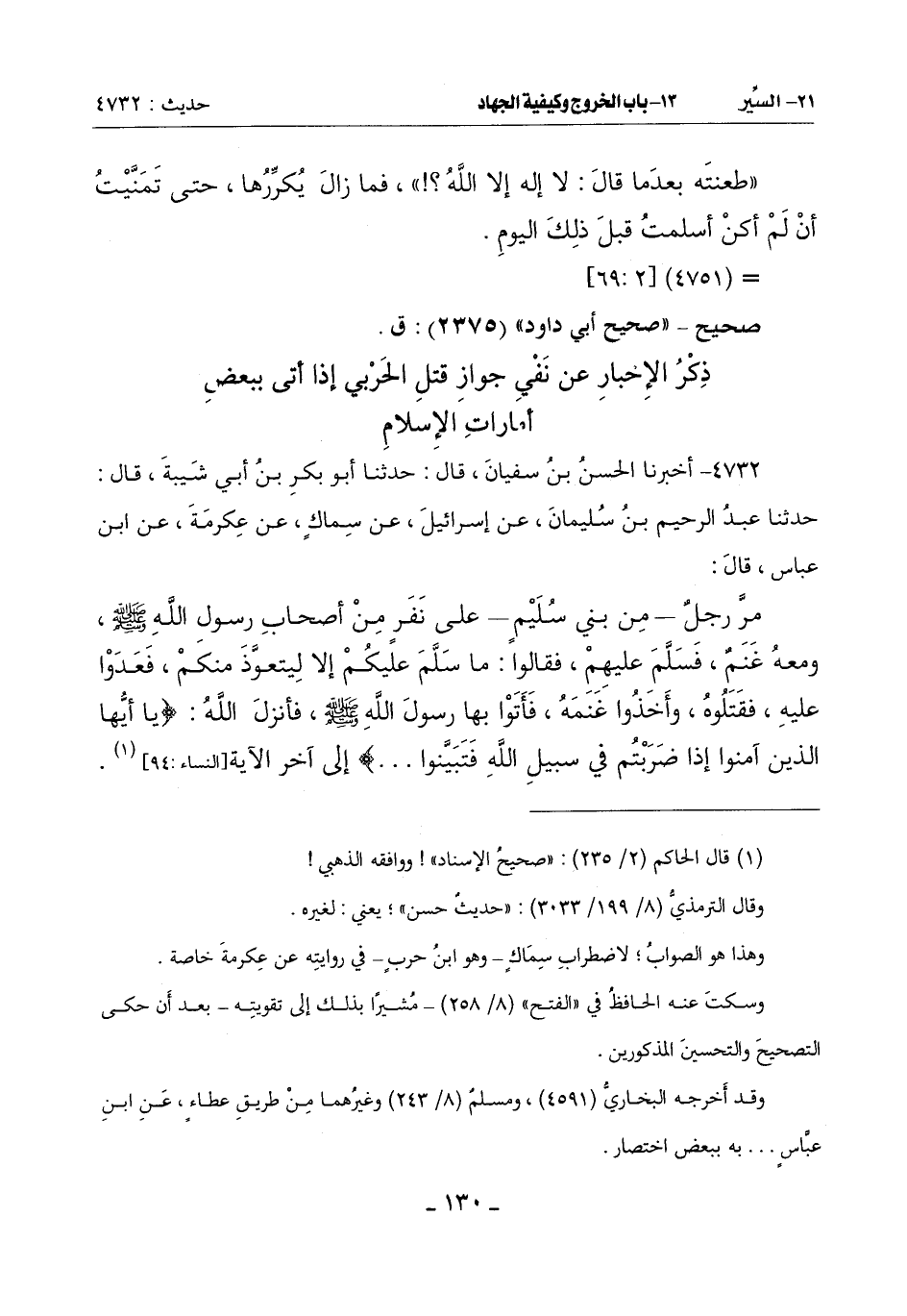 مَرَّ رَجُلٌ ـ مِنْ بَنِي سُلَيْمٍ ـ عَلَى نَفَرٍ مِنْ أَصْحَابِ رَسُولِ اللَّهِ صَلَّى اللَّهُ عَلَيْهِ وسلم وَمَعَهُ غَنَمٌ فَسَلَّمَ عَلَيْهِمْ فَقَالُوا: مَا سَلَّمَ عَلَيْكُمْ إِلَّا لِيَتَعَوَّذَ مِنْكُمْ فَعَدَوْا عَلَيْهِ فقتلوهُ وَأَخَذُوا غَنَمَهُ فَأَتَوْا بِهَا رَسُولُ اللَّهِ صَلَّى اللَّهُ عَلَيْهِ وَسَلَّمَ فَأَنْزَلَ اللَّهُ: {يَا أَيُّهَا الَّذِينَ آمَنُوا إِذَا ضَرَبْتُمْ فِي سَبِيلِ اللَّهِ فتبيَّنوا ..... } إلى آخر الآية [النساء: 94] (¬1). -[131]-