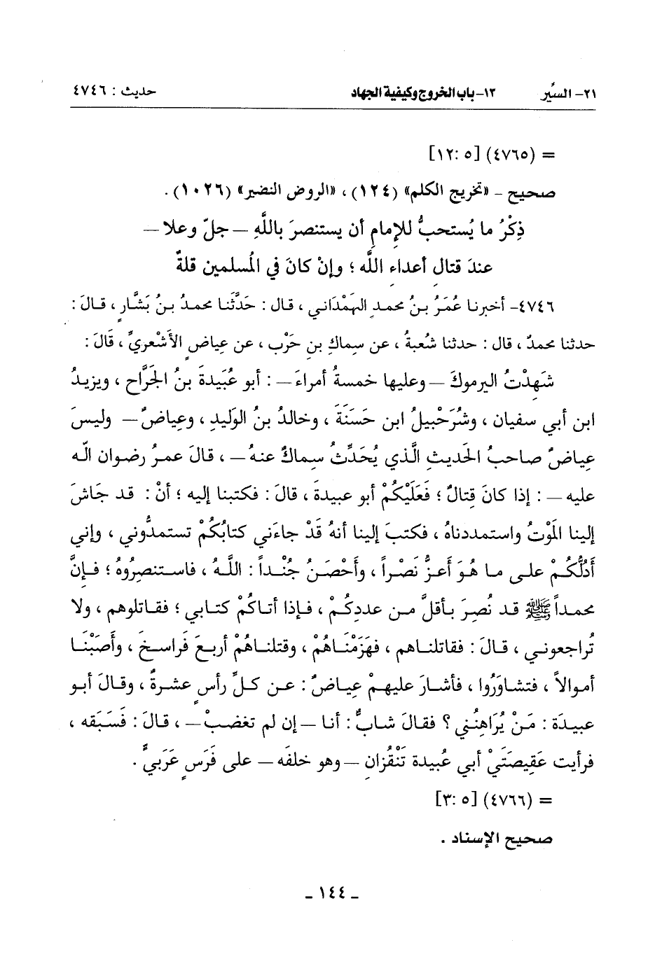 شَهِدْتُ الْيَرْمُوكَ ـ وَعَلَيْهَا خَمْسَةُ أُمَرَاءَ ـ: أَبُو عُبَيْدَةَ بْنُ الْجَرَّاحِ وَيَزِيدُ بْنُ أبي سفيان وشرحبيل بن حَسَنَةَ وَخَالِدُ بْنُ الْوَلِيدِ وَعِيَاضٌ - وَلَيْسَ عِيَاضٌ صَاحِبَ الْحَدِيثِ الَّذِي يُحَدِّثُ سِمَاكٌ عَنْهُ - قَالَ عُمَرُ رِضْوَانُ اللَّهِ عَلَيْهِ ـ: إِذَا كَانَ قِتَالٌ فَعَلَيْكُمْ أَبُو عُبَيْدَةَ قَالَ: فَكَتَبْنَا إِلَيْهِ أَنْ قَدْ جَاشَ إِلَيْنَا الْمَوْتُ وَاسْتَمْدَدْنَاهُ فَكَتَبَ إِلَيْنَا أَنَّهُ قَدْ جَاءَنِي كِتَابُكُمْ تستمدُّوني وَإِنِّي أَدُلُّكُمْ عَلَى مَا هُوَ أَعَزُّ نَصْرًا وَأَحْصَنُ جُنْدًا الله فاستنصروه فإن محمد صَلَّى اللَّهُ عَلَيْهِ وَسَلَّمَ قَدْ نُصِرَ بِأَقَلَّ مِنْ عَدَدِكُمْ فَإِذَا أَتَاكُمْ كِتَابِي فَقَاتِلُوهُمْ وَلَا تُرَاجِعُونِي قَالَ: فَقَاتَلْنَاهُمْ فَهَزَمْنَاهُمْ وَقَتَلْنَاهُمْ أَرْبَعَ فَرَاسِخَ وَأَصَبْنَا أَمْوَالًا فَتَشَاوَرُوا فَأَشَارَ عَلَيْهِمْ عِيَاضٌ عَنْ كُلِّ رَأْسٍ عَشْرَةٌ وَقَالَ أَبُو عُبَيْدَةَ: مَنْ يُرَاهِنُنِي فَقَالَ شابٌّ: أَنَا ـ إِنْ لَمْ تَغْضَبْ ـ قَالَ: فَسَبَقَهُ فَرَأَيْتُ عَقِيصَتَيْ أَبِي عُبَيْدَةَ تَنْقُزانِ ـ وهو خلفه ـ على فرس عربي
