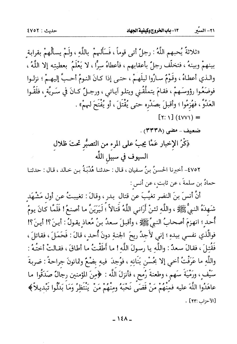 أنَّ أَنَسَ بْنَ النَّضْرِ تَغَيَّبَ عَنْ قِتَالِ بَدْرٍ وَقَالَ: تَغَيَّبْتُ عَنْ أَوَّلِ مَشْهَدٍ شَهِدَهُ النَّبِيُّ صَلَّى اللَّهُ عَلَيْهِ وَسَلَّمَ وَاللَّهِ لَئِنْ أَرَانِي اللَّهُ قِتَالًا لَيَرَيَنَّ مَا أَصْنَعُ فَلَمَّا كَانَ يَوْمُ أُحُدٍ انْهَزَمَ أَصْحَابُ النَّبِيِّ صَلَّى اللَّهُ عَلَيْهِ وَسَلَّمَ وَأَقْبَلَ سَعْدُ بْنُ مُعَاذٍ يَقُولُ: أَيْنَ؟! أَيْنَ؟! فَوَالَّذِي نَفْسِي بِيَدِهِ إِنِّي لَأَجِدُ رِيحَ الْجَنَّةِ دُونَ أُحُدٍ قَالَ: فَحَمَلَ فَقَاتَلَ , فقُتِلَ فَقَالَ سَعْدٌ: وَاللَّهِ يَا رَسُولَ اللَّهِ مَا أَطَقْتُ ما أطاق فقالت أخته: والله ماعرفت أَخِي إِلَّا بِحُسْنِ بَنَانِهِ فَوُجِدَ فِيهِ بِضْعٌ وَثَمَانُونَ جِرَاحَةً ضَرْبَةُ سَيْفٍ وَرَمْيَةُ سَهْمٍ وَطَعْنَةُ رُمْحٍ فَأَنْزَلَ اللَّهُ: {مِنَ الْمُؤْمِنِينَ رِجَالٌ صَدَقُوا مَا عَاهَدُوا اللَّهَ عَلَيْهِ فَمِنْهُمْ مَنْ قَضَى نَحْبَهُ وَمِنْهُمْ مَنْ يَنْتَظِرُ وَمَا بَدَّلُوا تَبْدِيلًا} [الأحزاب: 23]-[149]-
