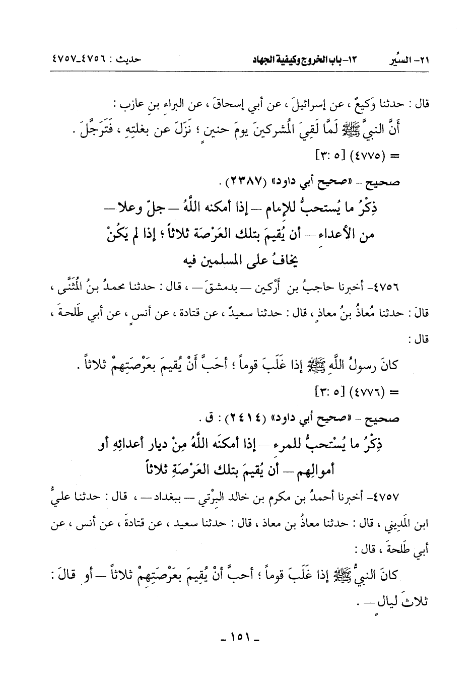 ذِكْرُ مَا يُسْتَحَبُّ لِلْمَرْءِ ـ إِذَا أَمْكَنَهُ اللَّهُ مِنْ دِيَارِ أَعْدَائِهِ أَوْ أَمْوَالِهِمْ ـ أَنْ يُقِيمَ بِتِلْكَ الْعَرْصَةِ ثَلَاثًا