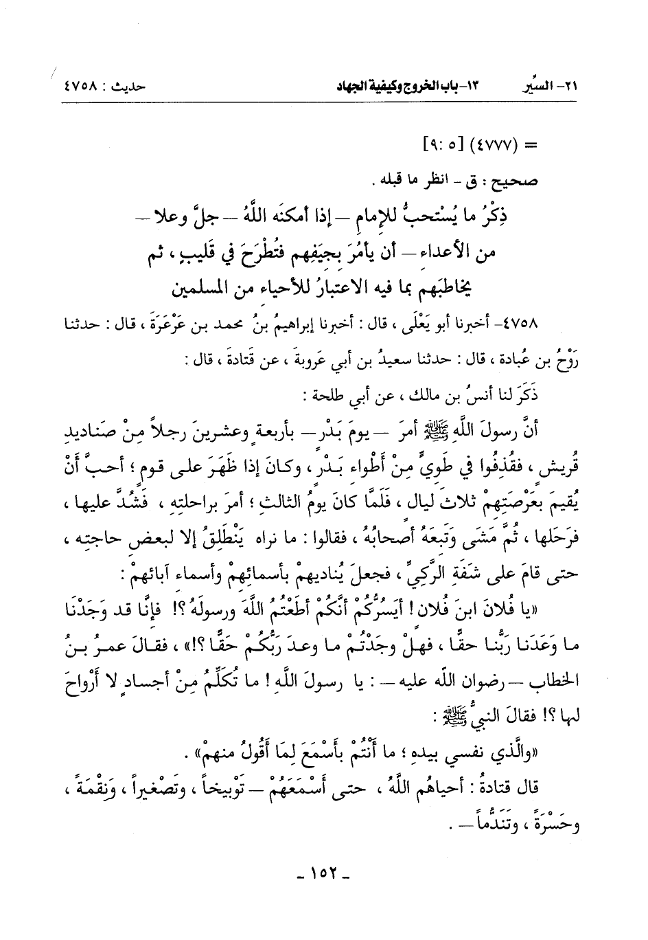 إن رسول الله صلى الله عليه وسلم أَمَرَ ـ يَوْمَ بَدْرٍ ـ بأربعةٍ وَعِشْرِينَ رَجُلًا مِنْ صَنَادِيدِ قُرَيْشٍ فقُذِفُوا فِي طَوِيٍّ مِنْ أَطْوَاءِ بَدْرٍ وَكَانَ إِذَا ظَهَرَ عَلَى قومٍ أَحَبَّ أَنْ يُقِيمَ بِعَرْصَتِهِمْ ثَلَاثَ لَيَالٍ فَلَمَّا كَانَ يَوْمُ الثَّالِثِ أَمَرَ بِرَاحِلَتِهِ فَشُدَّ عَلَيْهَا فرَحَلها ثُمَّ مَشَى وَتَبِعَهُ أَصْحَابُهُ فَقَالُوا: مَا نَرَاهُ يَنْطَلِقُ إِلَّا لِبَعْضِ حَاجَتِهِ حَتَّى قَامَ عَلَى شَفَةِ الرَّكِيِّ فَجَعَلَ يُنَادِيهِمْ بِأَسْمَائِهِمْ وَأَسْمَاءِ آبَائِهِمْ: