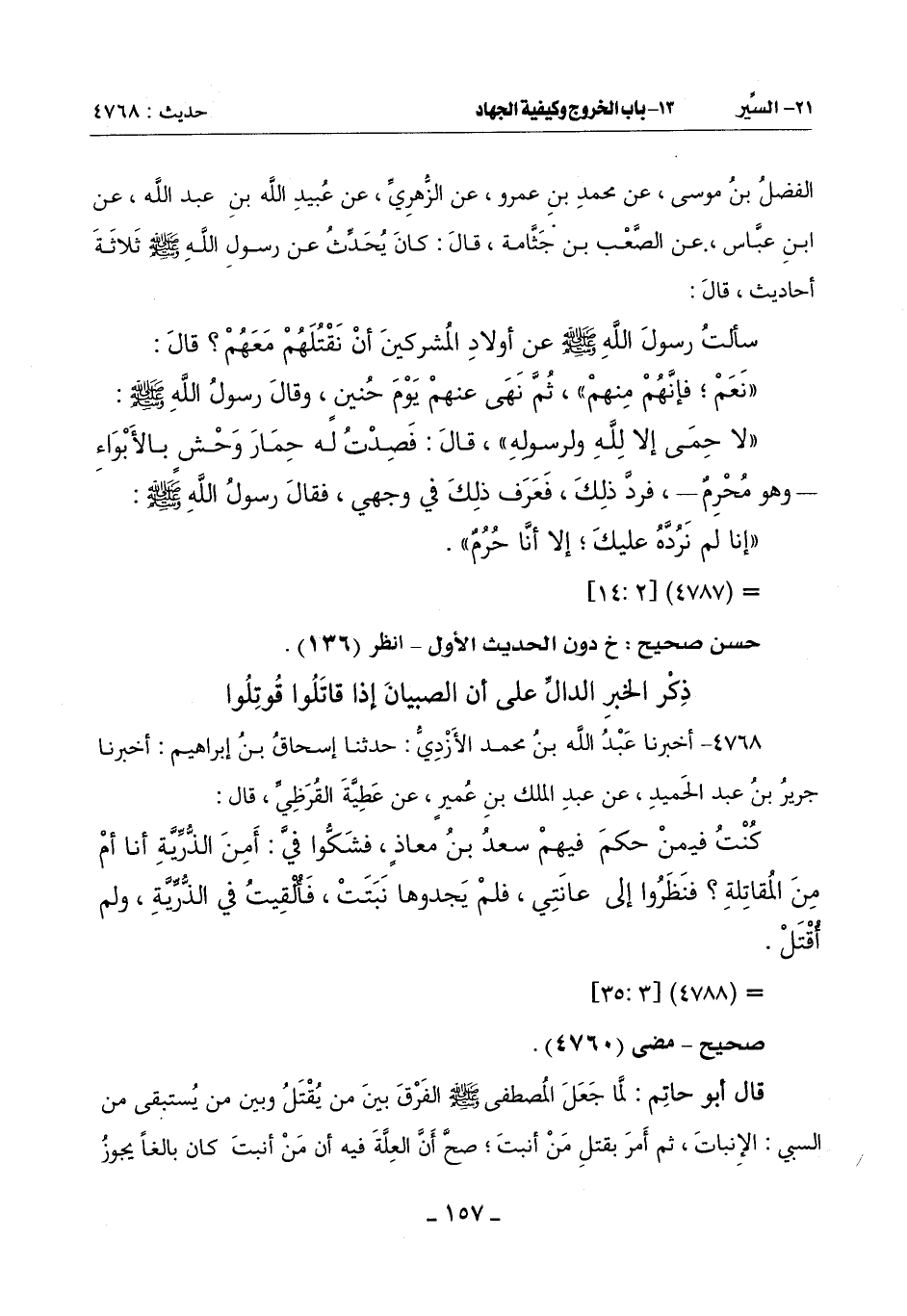 قَالَ أَبُو حَاتِمٍ: لَمَّا جَعَلَ الْمُصْطَفَى صَلَّى اللَّهُ عَلَيْهِ وَسَلَّمَ الْفَرْقَ بَيْنَ مَنْ يُقْتَلُ وَبَيْنَ مَنْ يُستبقى مِنَ السَّبْيِ الْإِنْبَاتَ ثُمَّ أَمَرَ بِقَتْلِ مَنْ أَنْبَتَ صحَّ أنَّ العِلَّةَ فِيهِ أَنَّ مَنْ أَنْبَتَ كَانَ بَالِغًا يجوزُ -[158]- أَنْ يُقاتِلَ وَلَمَّا صَحَّ مَا وَصَفْتُ مِنَ الْعِلَّةِ كَانَ فِيهَا الدَّلِيلُ عَلَى أَنَّ الصِّبْيَانَ وَالنِّسَاءَ مِنْ دُورِ الْحَرْبِ إِذَا قَاتِلُوا قُوتِلُوا إِذِ الْعِلَّةُ ـ الَّتِي مِنْ أَجْلِهَا رُفِعَ عَنْهُمُ الْقَتْلُ ـ عُدِمَتْ فِيهِمْ وَهِيَ مُجَانَبَةُ الْقِتَالِ