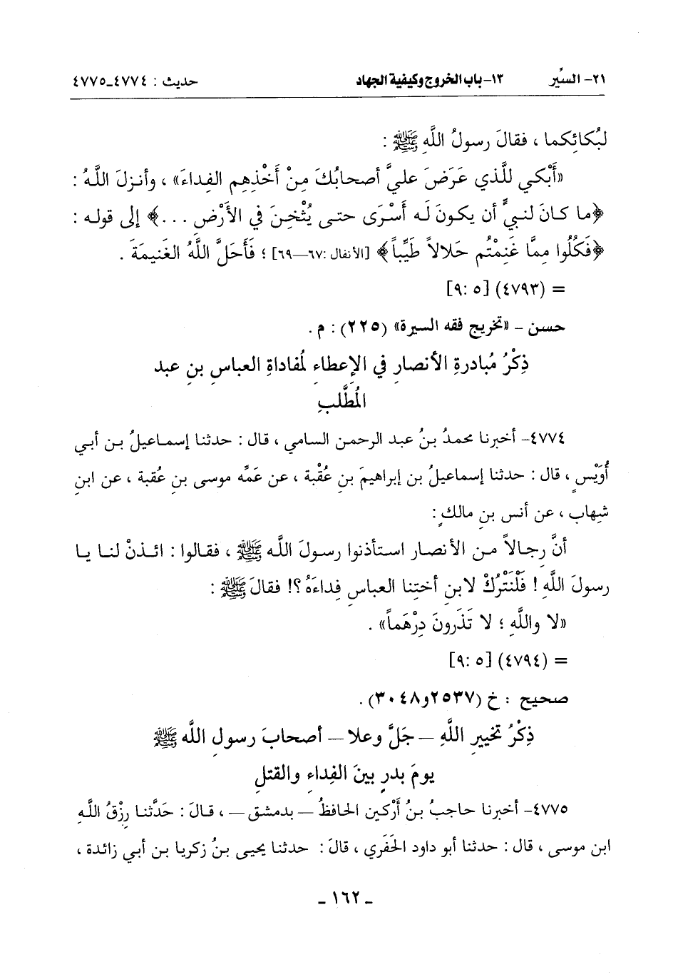 أَنَّ رِجَالًا مِنَ الْأَنْصَارِ اسْتَأْذَنُوا رَسُولِ اللَّهِ صَلَّى اللَّهُ عَلَيْهِ وَسَلَّمَ فَقَالُوا: ائْذَنْ لَنَا يَا رَسُولَ اللَّهِ فَلْنَتْرُكْ لِابْنِ أُخْتِنَا الْعَبَّاسِ فِداءَهُ فَقَالَ صَلَّى اللَّهُ عَلَيْهِ وَسَلَّمَ: