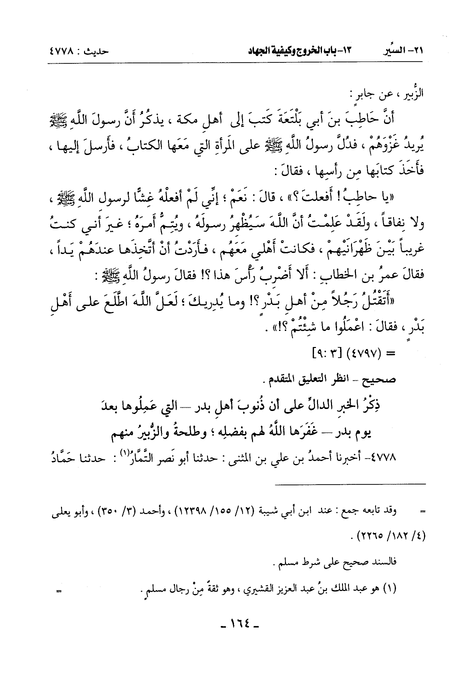 ولذلك؛ فإنِّي أخشى أن يكون وَهِمَ في جعله قوله - صَلَّى اللَّهُ عَلَيْهِ وَسَلَّمَ -: ((أَلَيْسَ قَدْ شَهِدَ بدراً ... )) إلخ في قصًّةِ الأنصاري الأعمى؛ فإن المحفوظ ـ عن جمعٍ من الصحابة ـ أنَّهُ قاله في قصَّةِ حاطبٍ التي في حديث جابرٍ قبله.