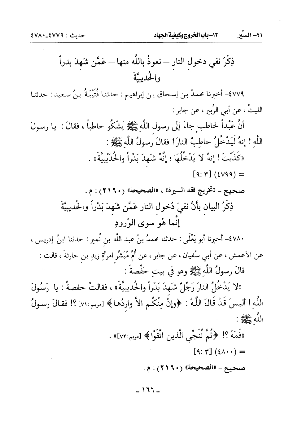 ذِكْرُ نَفْيِ دُخُولِ النَّارِ ـ نَعُوذُ بِاللَّهِ مِنْهَا ـ عَمَّنْ شَهِدَ بدراًَ وَالْحُدَيْبِيَةَ