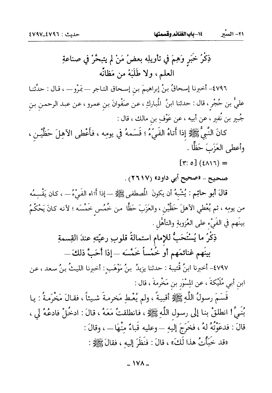 قَالَ أَبُو حَاتِمٍ: يُشْبِهُ أَنْ يَكُونَ الْمُصْطَفَى صَلَّى اللَّهُ عَلَيْهِ وَسَلَّمَ ـ إِذَا أَتَاهُ الْفَيْءُ ـ كَانَ يَقْسِمُهُ مِنْ يَوْمِهِ ثُمَّ يُعْطِي الْآهِلَ حَظَّيْنِ وَالْعَزَبَ حَظًّا مِنْ خُمُسٍ خَمْسَه لِأَنَّهُ كَانَ يَحْكُمُ بَيْنَهُمْ فِي الْفَيْءِ عَلَى الْعُزُوبَةِ والتأهل