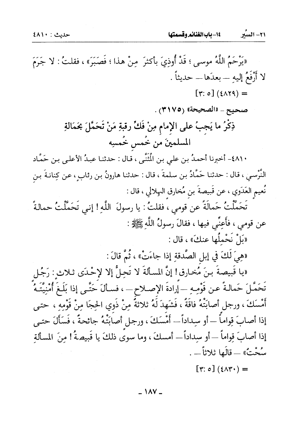 ذِكْرُ مَا يَجِبُ عَلَى الْإِمَامِ مِنْ فَكِّ رَقَبَةِ مَنْ تحمَّل بِحَمَالَةِ الْمُسْلِمِينَ مِنْ خُمْسِ خمسه
