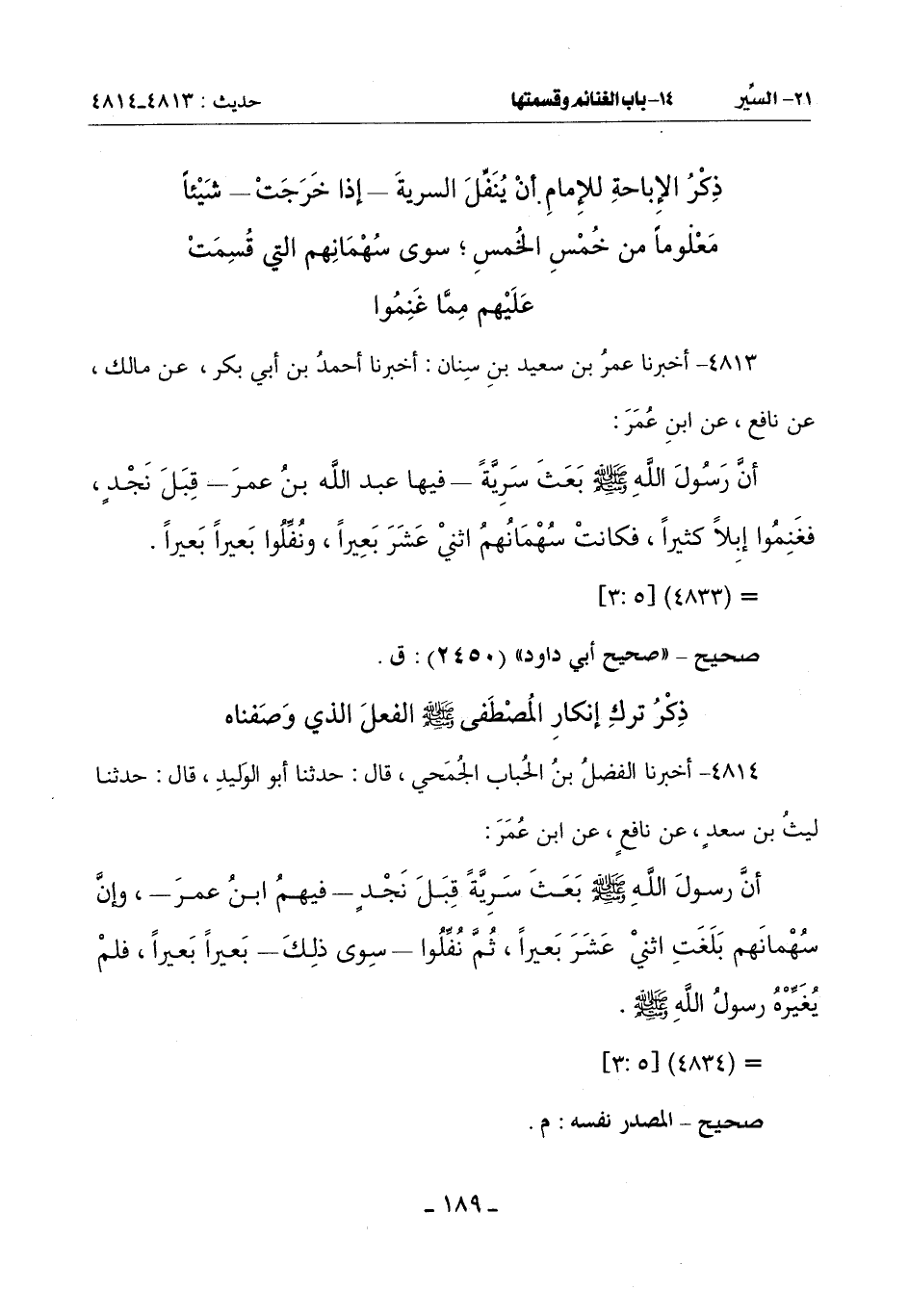 أَنَّ رَسُولَ اللَّهِ صَلَّى اللَّهُ عَلَيْهِ وَسَلَّمَ بَعَثَ سَرِيَّةً قِبَلَ نَجْدٍ ـ فِيهِمُ ابْنُ عُمَرَ ـ وَإِنَّ سُهْمانَهم بَلَغَتِ اثْنَيْ عَشَرَ بَعِيرًا ثُمَّ نُفِّلُوا ـ سِوَى ذَلِكَ ـ بَعِيرًا بَعِيرًا فَلَمْ يُغَيِّرْهُ رَسُولُ اللَّهِ صلى الله عليه وسلم