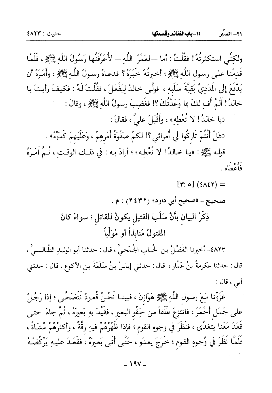 غَزَوْنَا مَعَ رَسُولِ اللَّهِ صَلَّى اللَّهُ عَلَيْهِ وَسَلَّمَ هَوَازِنَ فَبَيْنَا نَحْنُ قُعُودٌ نَتَضَحَّى إِذَا رَجُلٌ عَلَى جَمَلٍ أَحْمَرَ فَانْتَزَعَ طَلَقًا مِنْ حَقْوِ الْبَعِيرِ فقَيَّدَ بِهِ بَعِيرَهُ ثُمَّ جَاءَ حَتَّى قَعَدَ مَعَنَا يَتَغَدَّى فَنَظَرَ فِي وجُوهِ الْقَوْمِ فَإِذَا ظَهْرُهُمْ فِيهِ رِقَّةٌ وَأَكْثَرُهُمْ مُشَاةٌ فَلَمَّا نَظَرَ فِي وجُوهِ الْقَوْمِ خَرَجَ يَعْدُو حَتَّى أَتَى بَعِيرَهُ فَقَعَدَ عَلَيْهِ يَرْكُضُهُ -[198]- ـ وَهُوَ طَلِيعَةٌ لِلْكُفَّارِ ـ فاتَّبعه رَجُلٌ مِنَّا ـ مِنْ أَسْلَمَ ـ عَلَى نَاقَةٍ لَهُ وَرْقَاءَ ـ قَالَ إِيَاسٌ: قَالَ أَبِي ـ فاتَّبعته أَعْدُو وَاخْتَرَطْتُ سَيْفِي فَضَرَبْتُ رَأْسَهُ ثُمَّ جِئْتُ بِنَاقَتِهِ أَقُودُهَا ـ عَلَيْهَا سَلَبُهُ ـ فَاسْتَقْبَلَنِي رَسُولُ اللَّهِ صَلَّى اللَّهُ عَلَيْهِ وَسَلَّمَ مَعَ النَّاسِ فَقَالَ: