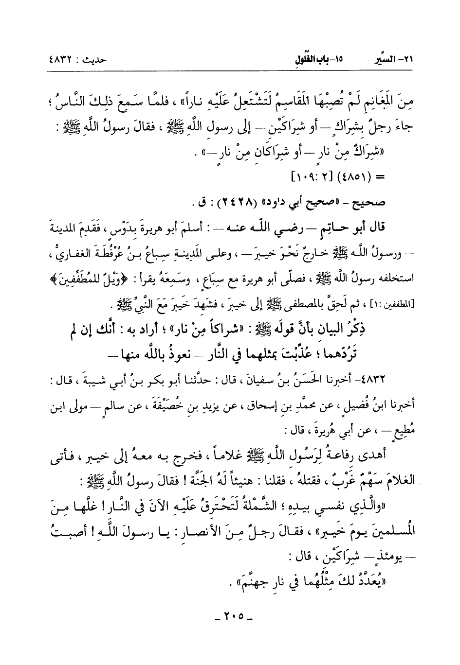 (والذي نَفْسِي بِيَدِهِ الشَّمْلَةُ لَتَحْتَرِقُ عَلَيْهِ الْآنَ فِي النَّارِ غلَّها مِنَ الْمُسْلِمِينَ يَوْمَ خَيْبَرَ) فَقَالَ: رجل من الأنصار: يَا رَسُولَ اللَّهِ صَلَّى اللَّهُ عَلَيْهِ وَسَلَّمَ أصبتُ ـ يومئذٍ ـ شِرَاكَيْنِ قَالَ: