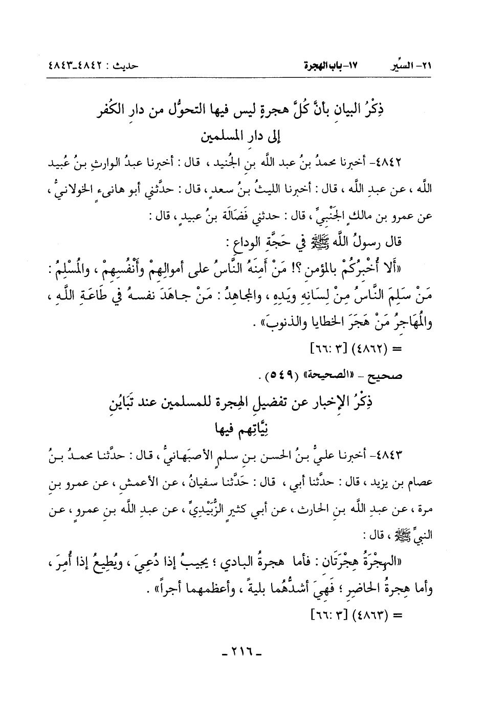 ذِكْرُ الْبَيَانِ بِأَنَّ كُلَّ هِجْرَةٍ لَيْسَ فِيهَا التَّحَوُّلُ مِنْ دَارِ الْكُفْرِ إِلَى دَارِ الْمُسْلِمِينَ