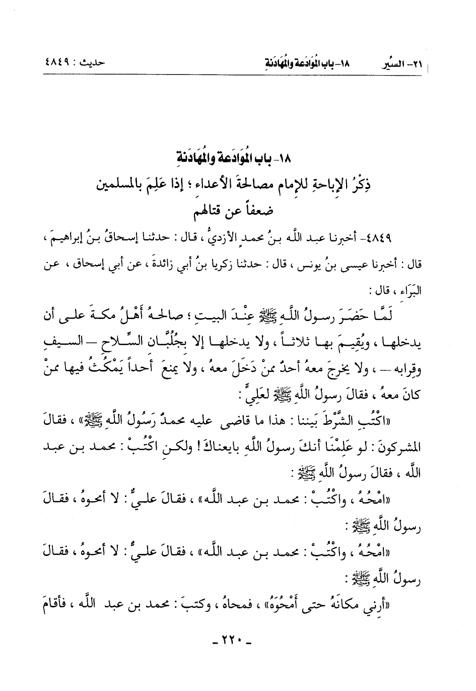 (امْحُهُ وَاكْتُبْ: مُحَمَّدُ بْنُ عَبْدِ اللَّهِ) فَقَالَ عَلِيٌّ: لَا أَمْحُوهُ فَقَالَ رَسُولُ اللَّهِ صَلَّى اللَّهُ عَلَيْهِ وَسَلَّمَ: