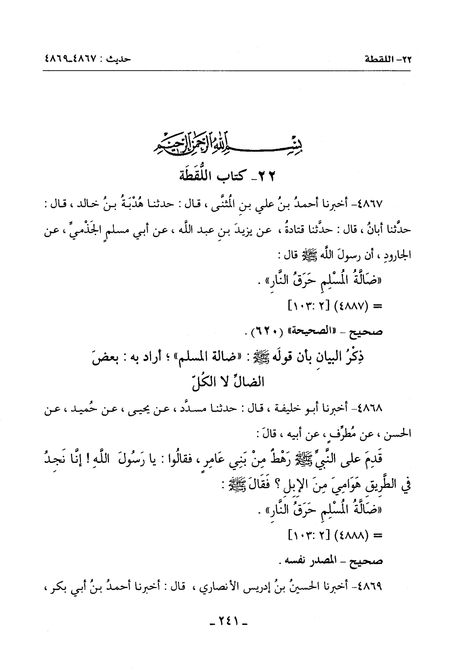 4868 - أَخْبَرَنَا أَبُو خَلِيفَةَ قَالَ: حَدَّثَنَا مُسَدَّدٌ عَنْ يَحْيَى عَنْ حُمَيْدٍ عَنِ الْحَسَنِ عَنْ مُطَرِّفٍ عَنْ أَبِيهِ قَالَ: