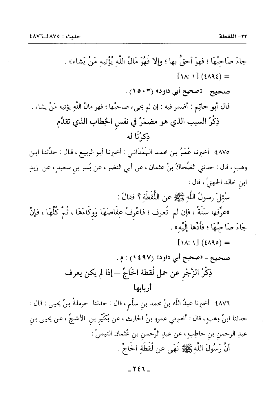 4875 - أَخْبَرَنَا عُمَرُ بْنُ مُحَمَّدٍ الْهَمْدَانِيُّ أَخْبَرَنَا أَبُو الرَّبِيعِ قَالَ: حَدَّثَنَا ابْنُ وَهْبٍ قَالَ حَدَّثَنِي الضَّحَّاكُ بْنُ عُثْمَانَ عَنْ أَبِي النَّضْرِ عَنْ بُسْرِ بْنِ سَعِيدٍ عَنْ زَيْدِ بْنِ خَالِدٍ الْجُهَنِيِّ قَالَ: