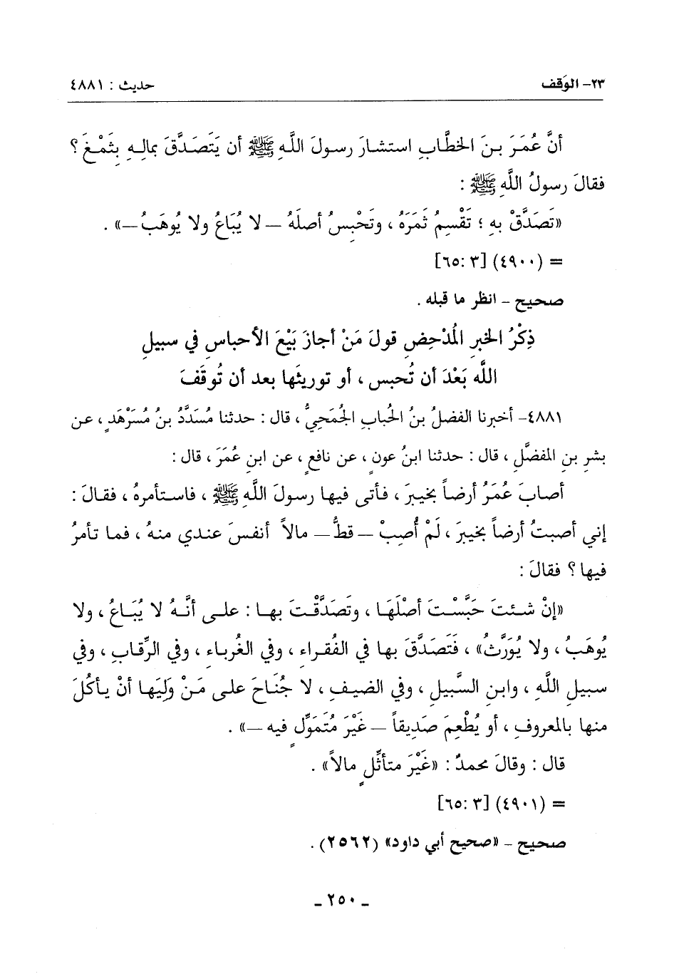 أَصَابَ عُمَرُ أَرْضًا بِخَيْبَرَ فَأَتَى فِيهَا رَسُولُ اللَّهِ صَلَّى اللَّهُ عَلَيْهِ وَسَلَّمَ فاستأمرهُ فَقَالَ: إِنِّي أَصَبْتُ أَرْضًا بِخَيْبَرَ لَمْ أُصِبْ ـ قطُّ ـ مَالًا أَنْفَسَ عِنْدِي مِنْهُ فَمَا تأمرُ فِيهَا؟ فَقَالَ: