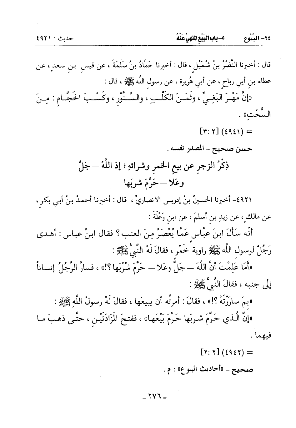 4921 - أَخْبَرَنَا الْحُسَيْنُ بْنُ إِدْرِيسَ الْأَنْصَارِيُّ قَالَ: أَخْبَرَنَا أحمد بن أبي بكر عن مالك عن زَيْدِ بْنِ أَسْلَمَ عَنِ ابْنِ وَعْلَةَ:
