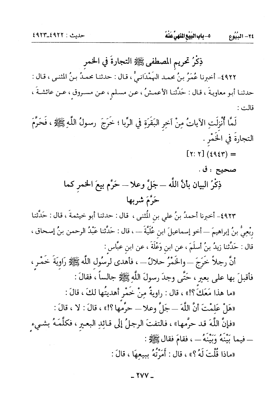 4923 - أَخْبَرَنَا أَحْمَدُ بْنُ عَلِيِّ بْنِ الْمُثَنَّى قَالَ حَدَّثَنَا أَبُو خَيْثَمَةَ قَالَ: حَدَّثَنَا رِبْعِيُّ بْنُ إِبْرَاهِيمَ ـ أَخُو إِسْمَاعِيلَ ابْنِ عُلَيَّةَ ـ قَالَ: حَدَّثَنَا عَبْدُ الرَّحْمَنِ بْنُ إِسْحَاقَ قَالَ: حَدَّثَنَا زَيْدُ بْنُ أَسْلَمَ عَنِ ابْنِ وَعْلَةَ عَنِ ابن عباس: