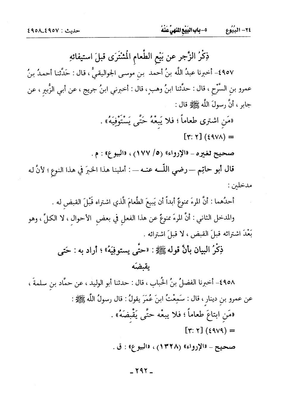 ذِكْرُ الْبَيَانِ بِأَنَّ قَوْلَهُ صَلَّى اللَّهُ عَلَيْهِ وَسَلَّمَ: ((حَتَّى يَسْتَوْفِيَهُ))؛ أَرَادَ بِهِ: حَتَّى يَقْبِضَهُ