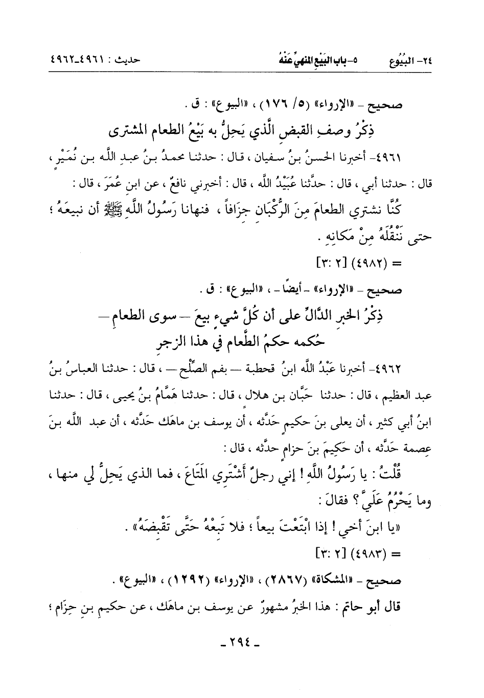 4962 - أَخْبَرَنَا عَبْدُ اللَّهِ بْنُ قَحْطَبَةَ بِفَمِ الصُّلْحِ قَالَ: حَدَّثَنَا الْعَبَّاسُ بْنُ عَبْدِ الْعَظِيمِ قَالَ: حدثنا حبان بن هلال قَالَ: حَدَّثَنَا هَمَّامُ بْنُ يَحْيَى قَالَ: حَدَّثَنَا ابْنُ أَبِي كَثِيرٍ أَنَّ يَعْلَى بْنَ حَكِيمٍ حدَّثه أَنَّ يُوسُفَ بْنَ مَاهَكٍ حَدَّثَهُ أَنَّ عَبْدَ اللَّهِ بْنَ عِصْمَةَ حَدَّثَهُ أَنَّ حَكِيمَ بْنَ حِزَامٍ حَدَّثَهُ قَالَ: