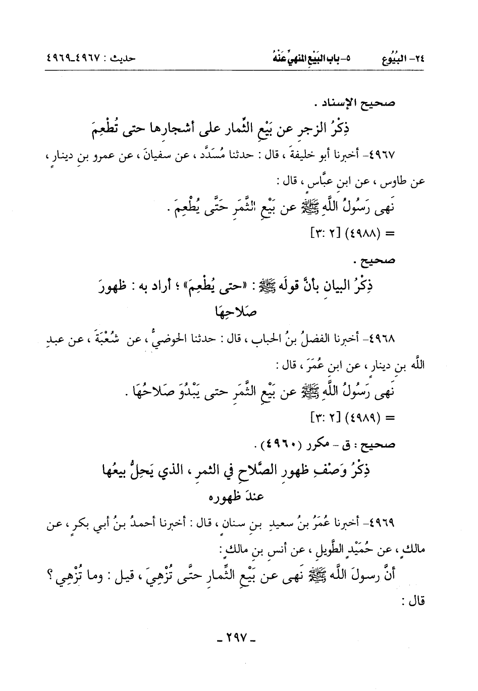 أَنَّ رَسُولَ اللَّهِ صَلَّى اللَّهُ عَلَيْهِ وَسَلَّمَ نَهَى عَنْ بَيْعِ الثِّمَارِ حَتَّى تُزْهِيَ قِيلَ: وَمَا تُزْهِي؟ قَالَ: -[298]-