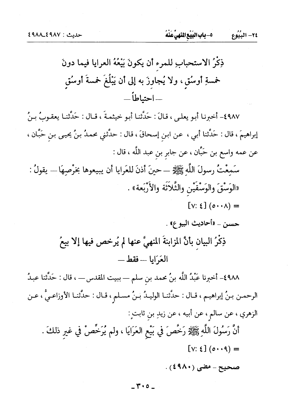 ذِكْرُ الِاسْتِحْبَابِ لِلْمَرْءِ أَنْ يَكُونَ بَيْعُهُ الْعَرَايَا فِيمَا دُونَ خَمْسَةِ أَوْسُقٍ وَلَا يُجَاوِزُ بِهِ إِلَى أَنْ يَبْلُغَ خَمْسَةَ أَوْسُقٍ ـ احْتِيَاطًا ـ