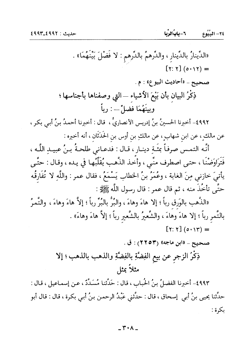 (الذَّهَبُ بِالْوَرِقِ رِبًا إِلَّا هَاءً وَهَاءً والبُرُّ بالبُرِّ رِبًا إِلَّا هاءَ وهاءَ والتَّمر بِالتَّمْرِ رِبًا إِلَّا هَاءً وَهَاءً وَالشَّعِيرُ بالشعير رباً إلا هاء وهاء)