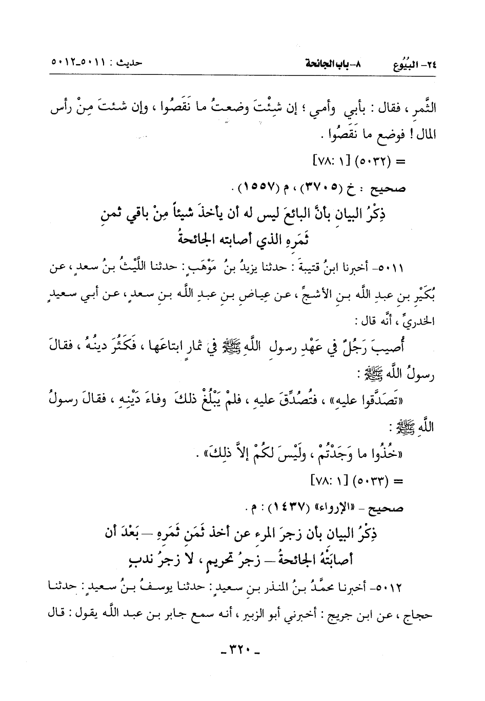 (إِنْ بِعْتَ مِنْ أَخِيكَ ثَمَرًا فَأَصَابَتْهُ جَائِحَةٌ فَلَا يَحِلُّ لَكَ أَنْ تَأْخُذَ مِنْهُ شَيْئًا بِمَ تَأْخُذُ مِنْ مال أخيك بغير حق؟ )
