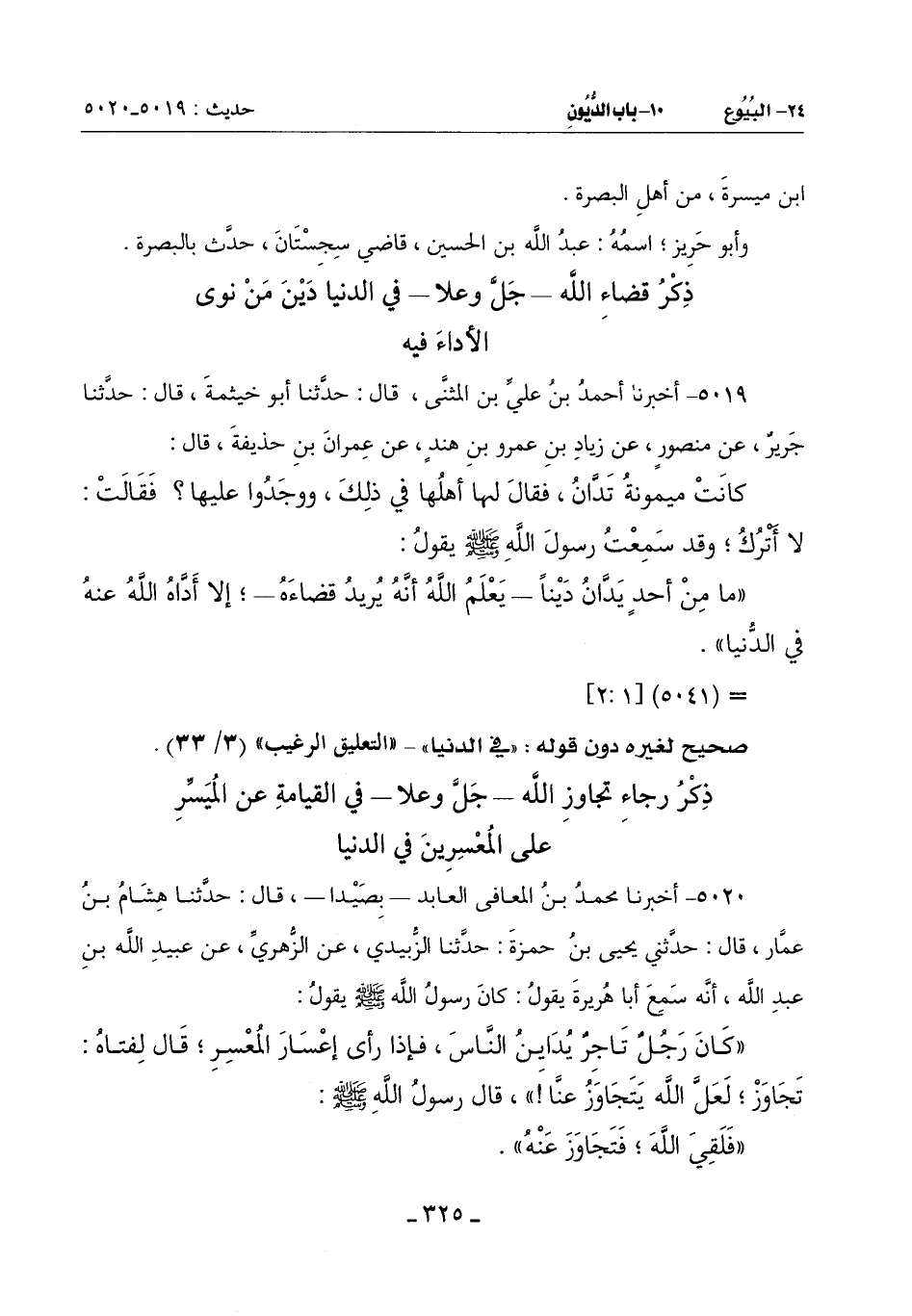 (مَا مِنْ أحدٍ يَدَّانُ دَيْنًا ـ يَعْلَمُ اللَّهُ أَنَّهُ يُرِيدُ قضاءَهُ ـ إِلَّا أدَّاهُ اللَّهُ عَنْهُ فِي الدنيا)