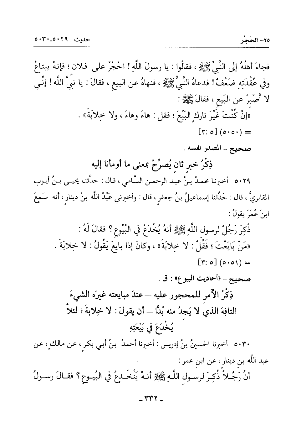 أَنَّ رَجُلًا ذُكِرَ لِرَسُولِ اللَّهِ صَلَّى اللَّهُ عَلَيْهِ وَسَلَّمَ أَنَّهُ يَنْخَدِعُ فِي الْبُيُوعِ فَقَالَ رَسُولُ -[333]- اللَّهِ صَلَّى اللَّهُ عَلَيْهِ وَسَلَّمَ: