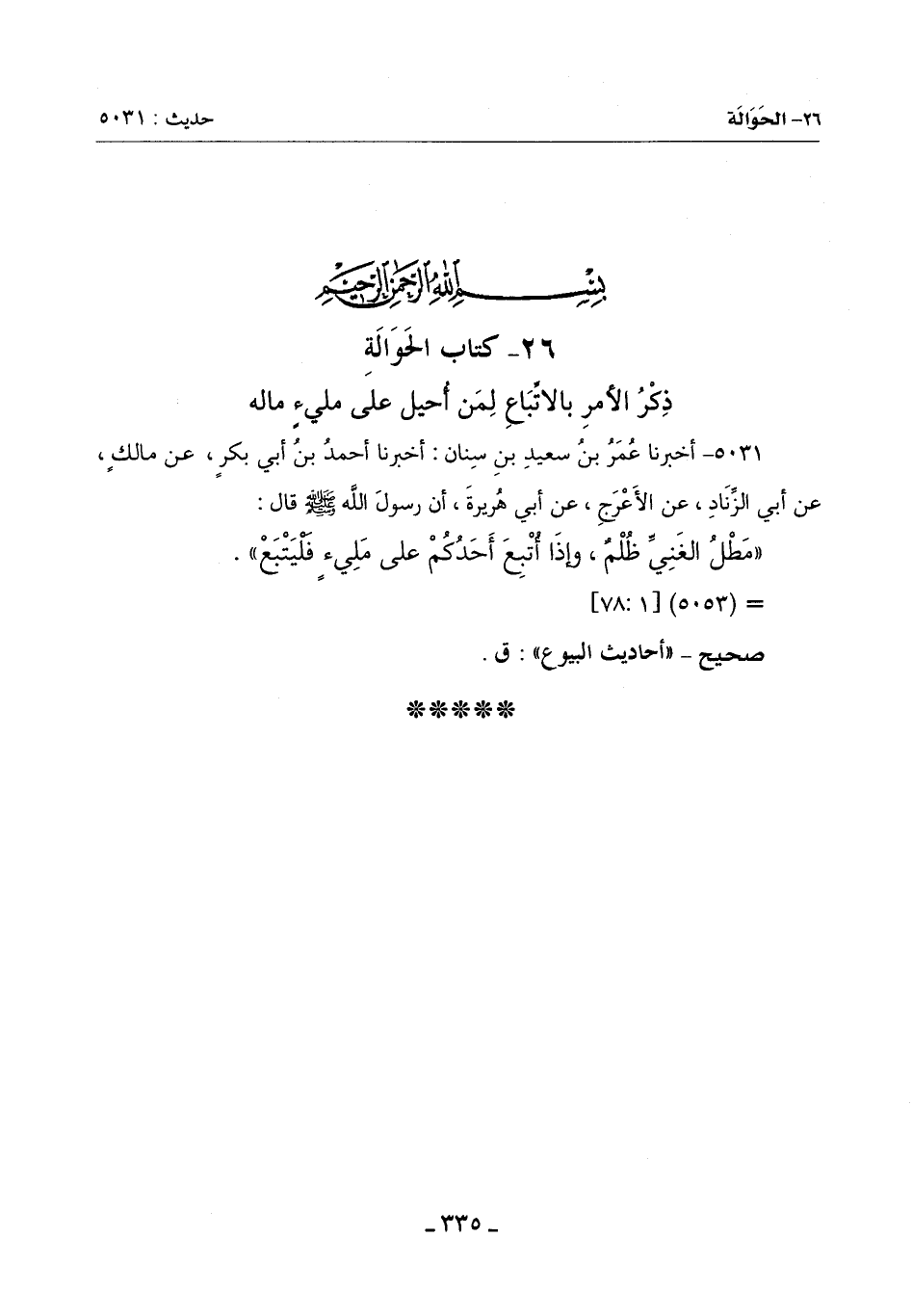 5031 - أَخْبَرَنَا عُمَرُ بْنُ سَعِيدِ بْنِ سِنَانٍ أَخْبَرَنَا أحمد بن أبي بكر عن مالك عن أَبِي الزِّنَادِ عَنِ الْأَعْرَجِ عَنْ أَبِي هُرَيْرَةَ إن رسول الله صلى الله عليه وسلم قَالَ:
