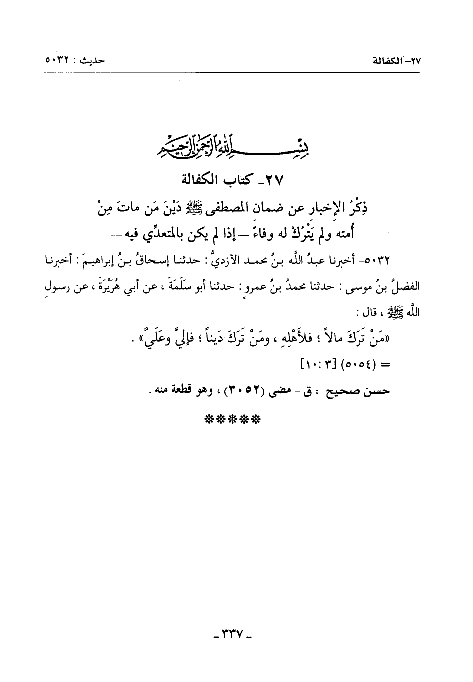 ذِكْرُ الْإِخْبَارِ عَنْ ضَمَانِ الْمُصْطَفَى صَلَّى اللَّهُ عَلَيْهِ وَسَلَّمَ دَيْنَ مَنْ مَاتَ مِنْ أُمَّتِهِ وَلَمْ يَتْرُكْ لَهُ وَفَاءً ـ إِذَا لَمْ يَكُنْ بالمتعدي فيه ـ.