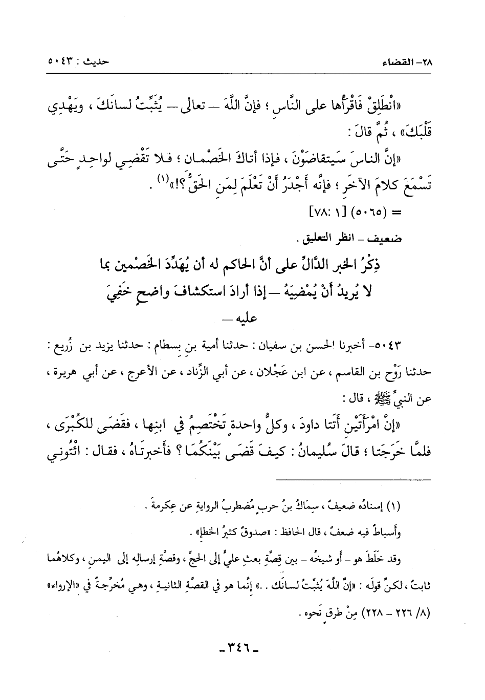 ذِكْرُ الْخَبَرِ الدَّالَّ عَلَى أنَّ الْحَاكِمَ لَهُ أَنْ يُهَدِّدَ الْخَصْمَيْنِ بِمَا لَا يُريدُ أَنْ يُمْضِيهُ ـ إِذَا أَرَادَ اسْتِكْشَافَ واضحٍ خَفِيَ عَلَيْهِ ـ.