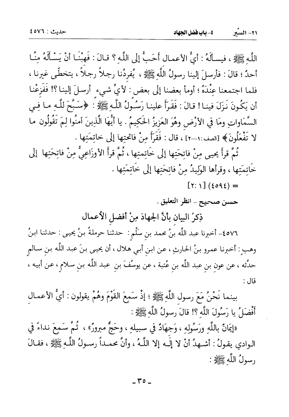 (إِيمَانٌ بِاللَّهِ وَرَسُولِهِ وَجِهَادٌ فِي سَبِيلِهِ وَحَجٌّ مَبْرُورٌ) ثُمَّ سَمِعَ نِدَاءً فِي الْوَادِي يَقُولُ: أَشْهَدُ أَنْ لَا إِلَهَ إِلَّا اللَّهُ وَأَنَّ مُحَمَّدًا رَسُولُ اللَّهِ صَلَّى اللَّهُ عَلَيْهِ وَسَلَّمَ فَقَالَ رَسُولُ اللَّهِ صَلَّى اللَّهُ عَلَيْهِ وَسَلَّمَ: -[36]-
