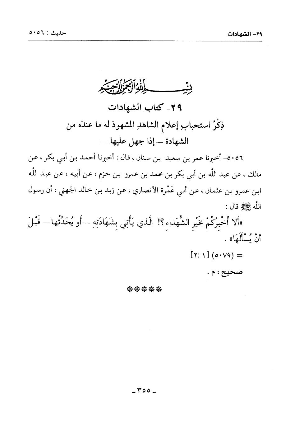(أَلَا أُخْبِرُكُمْ بِخَيْرِ الشُّهَدَاءِ؟ الَّذِي يَأْتِي بِشَهَادَتِهِ ـ أَوْ يُحَدِّثُها ـ قَبْلَ أَنْ يُسْأَلَهَا)