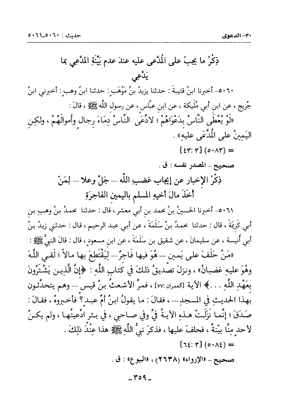 (لَوْ يُعطى النَّاسُ بِدَعْوَاهُمْ لادَّعى النَّاسُ دِمَاءَ رجالٍ وَأَمْوَالَهُمْ وَلَكِنَّ الْيَمِينَ عَلَى المُدَّعَى عَلَيْهِ)