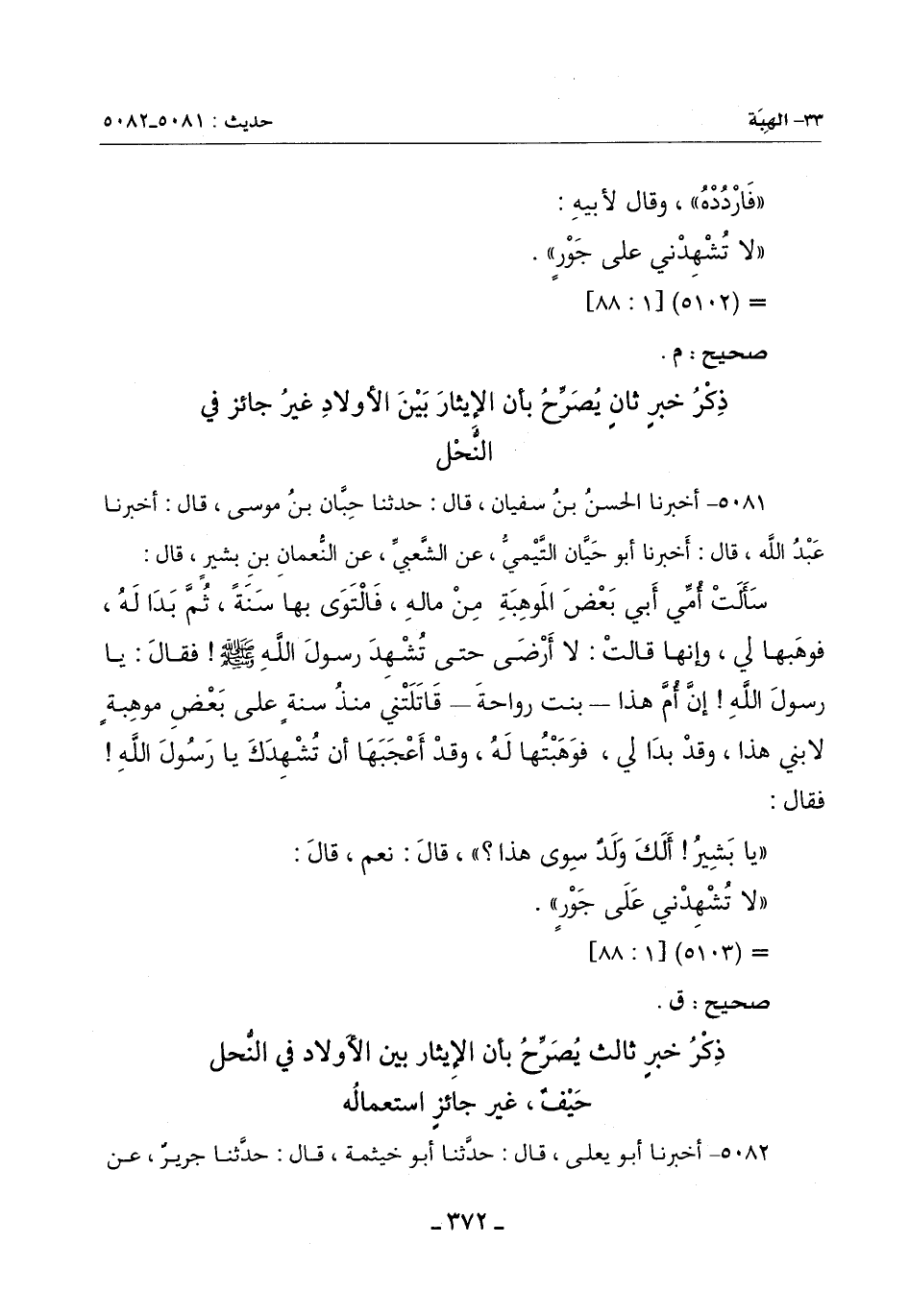 ذكرُ خبرٍ ثانٍ يُصَرِّحُ بِأَنَّ الْإِيثَارَ بَيْنَ الْأَوْلَادِ غَيْرُ جَائِزٍ فِي النَّحْلِ
