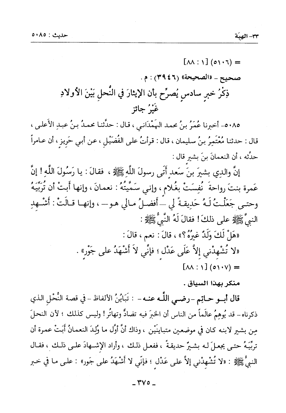 قَالَ أَبُو حَاتِمٍ ـ رَضِيَ اللَّهُ عَنْهُ ـ: تَبَايُنُ الْأَلْفَاظِ ـ فِي قِصَّةِ النَّحْلِ الَّذِي ذَكَرْنَاهُ ـ قَدْ يُوهِمُ عَالِمًا مِنَ النَّاسِ أَنَّ الْخَبَرَ فِيهِ تضادٌّ وَتَهَاتُرٌ وَلَيْسَ كَذَلِكَ لِأَنَّ النحلَ مِنْ بَشِيرٍ لِابْنِهِ كَانَ فِي مَوْضِعَيْنِ مُتَبَايِنَيْنِ وَذَاكَ أنَّ أوَّل ماولد النُّعْمَانُ أَبَتْ عَمْرَةُ أَنْ تربِّيَهُ حَتَّى يَجْعَلَ لَهُ بَشِيرٌ حَدِيقَةً فَفَعَلَ ذَلِكَ وَأَرَادَ الْإِشْهَادَ عَلَى ذَلِكَ فَقَالَ النَّبِيُّ صَلَّى اللَّهُ عَلَيْهِ وَسَلَّمَ: (لَا تُشْهِدْنِي إِلَّا عَلَى عَدْلٍ فَإِنِّي لَا أَشْهَدُ عَلَى جَوْرٍ) عَلَى مَا فِي خَبَرِ -[376]- أَبِي حَرِيزٍ تُصرِّح هَذِهِ اللَّفْظَةُ أَنَّ الْحَيْفَ فِي النَّحْلِ بَيْنَ الْأَوْلَادِ غَيْرُ جَائِزٍ فَلَمَّا أَتَى عَلَى الصَّبِيِّ مُدَّةٌ قَالَتْ عَمْرَةُ لِبَشِيرٍ: انْحَلِ ابْنِي هَذَا فَالْتَوَى عَلَيْهِ سَنَةً أَوْ سَنَتَيْنِ عَلَى مَا فِي خَبَرِ أَبِي حَيَّانَ التَّيْمِيِّ وَالْمُغِيرَةِ عَنِ الشَّعْبِيِّ فَنَحَلَهُ غُلَامًا فَلَمَّا جَاءَ الْمُصْطَفَى صَلَّى اللَّهُ عَلَيْهِ وَسَلَّمَ ليُشهده قَالَ: (لَا تُشْهِدْنِي عَلَى جَوْرٍ) وَيُشْبِهُ أَنْ يَكُونَ النُّعْمَانُ قَدْ نَسِيَ الْحُكْمَ الْأَوَّلَ أَوْ تَوَهَّمَ أَنَّهُ قَدْ نُسِخَ وَقَوْلُهُ صَلَّى اللَّهُ عَلَيْهِ وَسَلَّمَ: (لَا تُشهدني عَلَى جَوْرٍ) ـ فِي الْكَرَّةِ الثَّانِيَةِ ـ زِيَادَةُ تَأْكِيدٍ فِي نَفْيِ جَوَازِهِ وَالدَّلِيلُ عَلَى أَنَّ النَّحْلَ فِي الْغُلَامِ لِلنُّعْمَانِ كَانَ ذَلِكَ وَالنُّعْمَانُ مُتَرَعْرِعٌ أَنَّ فِيَ خَبَرِ عَاصِمٍ عَنِ الشَّعْبِيِّ: أَنَّ النَّبِيَّ صَلَّى اللَّهُ عَلَيْهِ وَسَلَّمَ قَالَ لَهُ: (مَا هَذَا الْغُلَامُ؟ ) قَالَ: غُلَامٌ أَعْطَانِيهِ أَبِي فدلَّتك هَذِهِ اللَّفْظَةُ عَلَى أَنَّ هَذَا النُّحل غَيْرَ النُّحْلِ الَّذِي فِي خَبَرِ أَبِي حَرِيزٍ فِي الْحَدِيقَةِ لِأَنَّ ذَلِكَ عِنْدَ امْتِنَاعِ عَمْرَةَ عَنْ تَرْبِيَةِ النُّعْمَانِ عِنْدَمَا وَلَدَتْهُ ضِدَّ قَوْلِ مَنْ زَعَمَ أَنَّ أَخْبَارَ الْمُصْطَفَى صلى الله عليه وسلم تتضاد وتهاتر