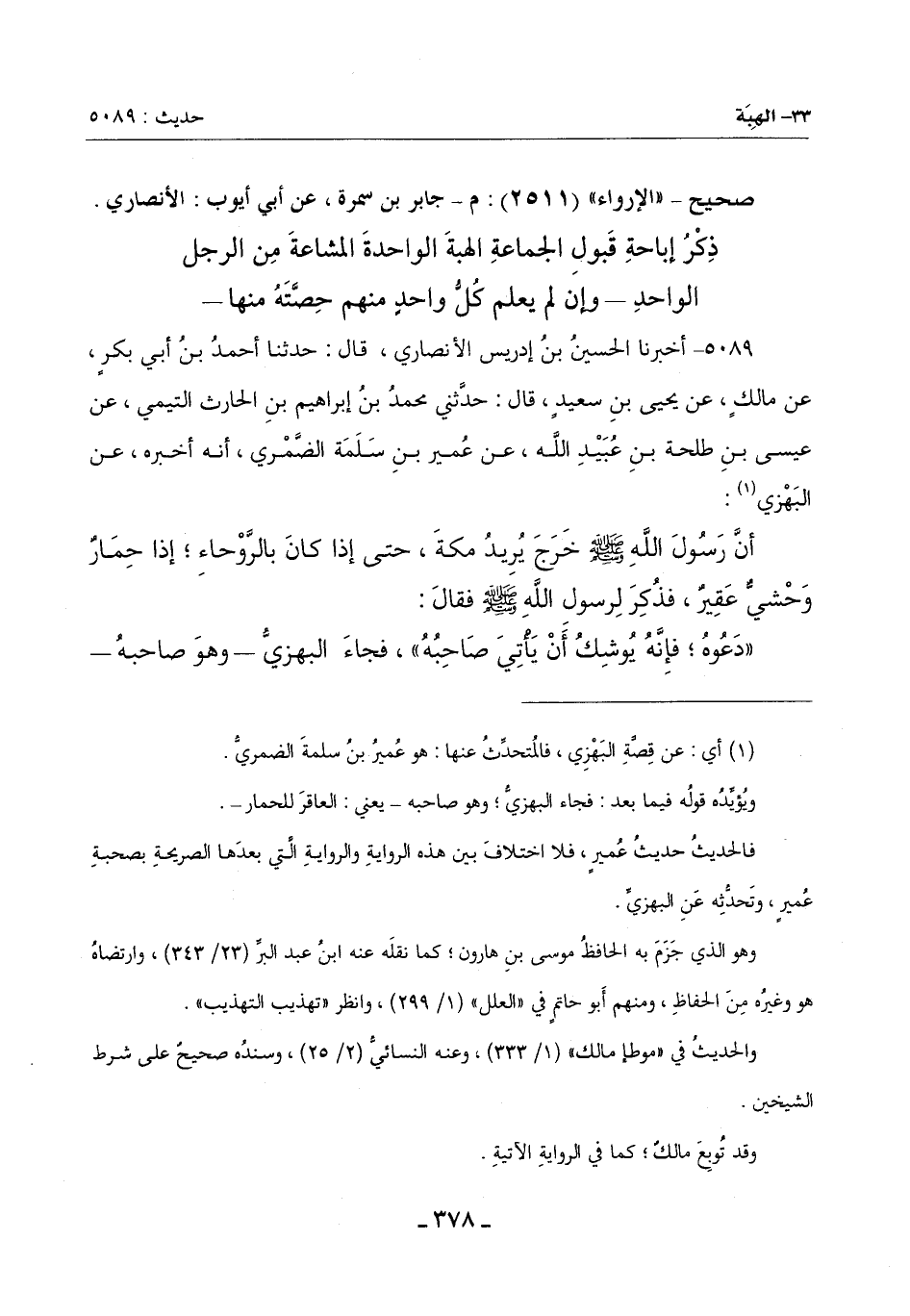 5089 - أَخْبَرَنَا الْحُسَيْنُ بْنُ إِدْرِيسَ الْأَنْصَارِيُّ قَالَ: حَدَّثَنَا أحمد بن أبي بكر عن مالك عن يَحْيَى بْنَ سَعِيدٍ قَالَ: حَدَّثَنِي مُحَمَّدُ بْنُ إِبْرَاهِيمَ بْنِ الْحَارِثِ التَّيْمِيِّ عَنْ عِيسَى بْنِ طَلْحَةَ بْنِ عُبَيْدِ اللَّهِ عَنْ عُمَيْرِ بْنِ سَلَمَةَ الضَّمْرِيِّ: أَنَّهُ أَخْبَرَهُ عَنِ الْبَهْزِيِّ (¬1):