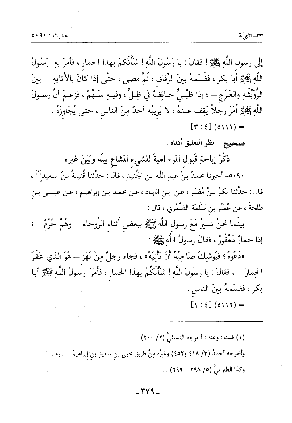 ذِكْرُ إِبَاحَةِ قَبُولِ الْمَرْءِ الْهِبَةَ لِلشَّيْءِ الْمَشَاعِ بَيْنَهُ وَبَيْنَ غَيْرِهِ
