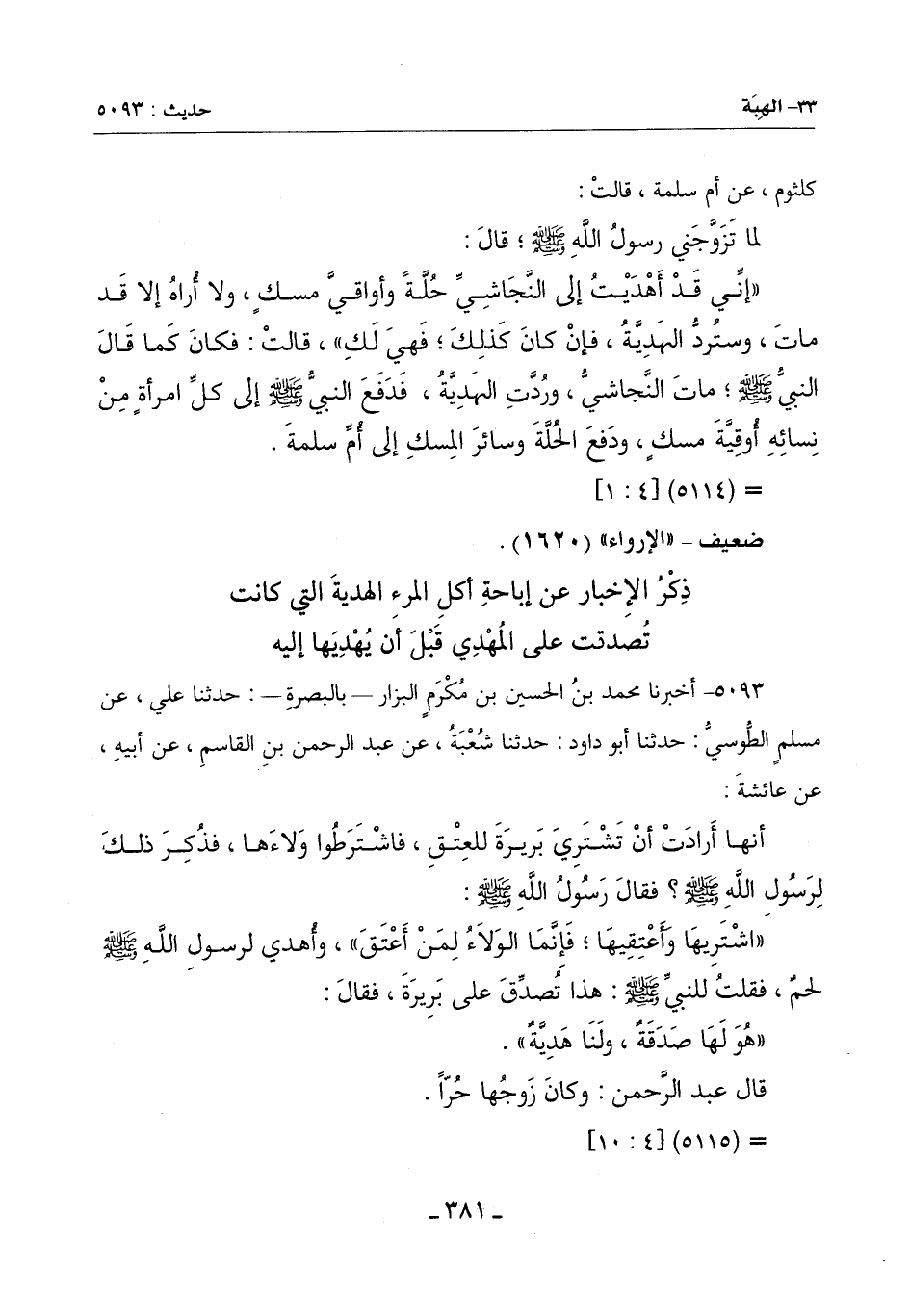 5093 - أخبرنا محمد بن الحسن بن مكرم البزار بالبصرة حدثنا علي عن مُسْلِمٍ الطُّوسِيُّ حَدَّثَنَا أَبُو دَاوُدَ حَدَّثَنَا شُعْبَةُ عَنْ عَبْدِ الرَّحْمَنِ بْنِ الْقَاسِمِ عَنْ أَبِيهِ عَنْ عَائِشَةَ: