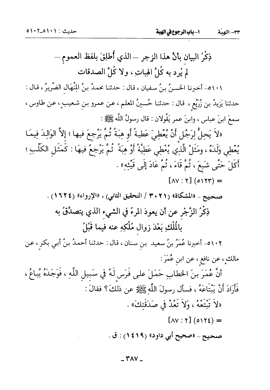 (لَا يَحِلُّ لِرَجُلٍ أَنْ يعطي عطية أو هبة ثم يرجع فيها إِلَّا الْوَالِدَ فِيمَا يُعْطِي وَلَدَهُ وَمَثَلُ الَّذِي يعطي عطية أو هبة ثم يرجع فيها كَمَثَلِ الْكَلْبِ أَكَلَ حَتَّى شَبِعَ ثُمَّ قَاءَ ثم عاد إلى قيئه)