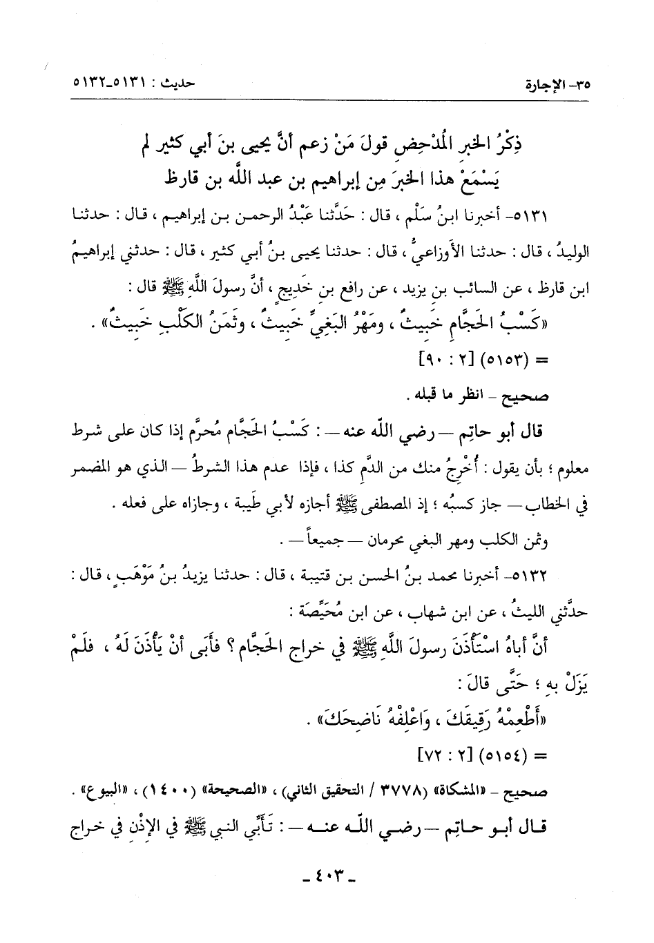 5131 - أَخْبَرَنَا ابْنُ سَلْمٍ قَالَ: حَدَّثَنَا عَبْدُ الرَّحْمَنِ بْنُ إِبْرَاهِيمَ قَالَ: حَدَّثَنَا الْوَلِيدُ قَالَ: حَدَّثَنَا الْأَوْزَاعِيِّ قَالَ: حَدَّثَنَا يَحْيَى بْنِ أَبِي كَثِيرٍ قَالَ: حَدَّثَنِي إِبْرَاهِيمُ بْنُ قَارِظٍ عَنِ السَّائِبِ بْنِ يَزِيدَ عَنْ رَافِعِ بْنِ خَدِيجٍ أَنَّ رسول الله صلى الله عليه وسلم قال:
