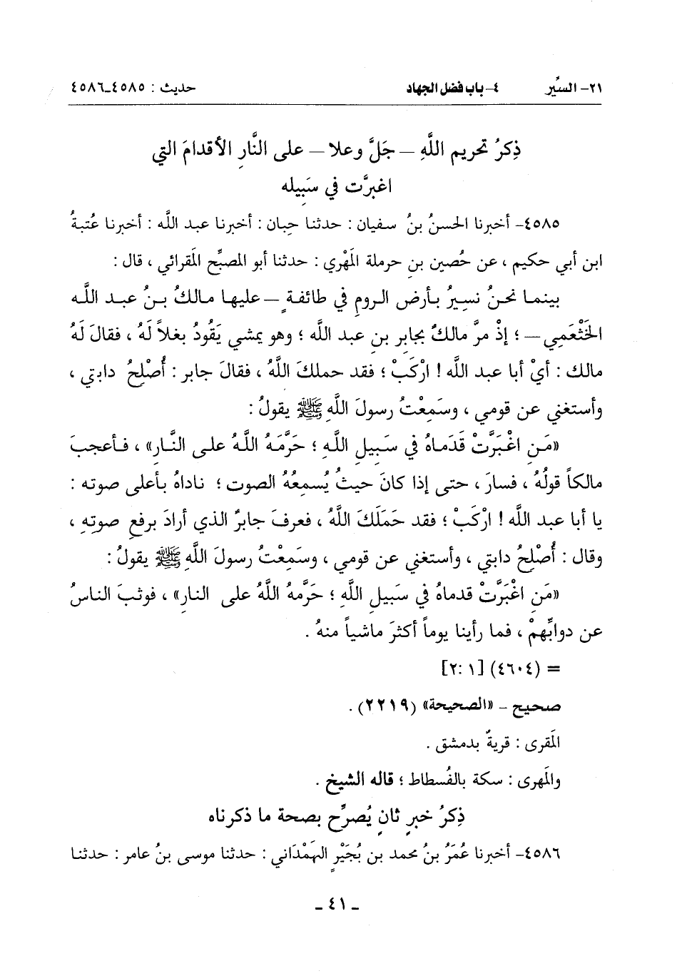 (مَنِ اغبّرَّت قَدَمَاهُ فِي سَبِيلِ اللَّهِ حرَّمه اللَّهُ عَلَى النَّارِ) فَأَعْجَبَ مَالِكًا قَوْلُهُ فَسَارَ حَتَّى إِذَا كَانَ حَيْثُ يُسمِعُهُ الصَّوْتَ نَادَاهُ بِأَعْلَى صَوْتِهِ يَا أَبَا عَبْدِ اللَّهِ ارْكَبْ فَقَدْ حَمَلَكَ اللَّهُ فَعَرَفَ جَابِرٌ الَّذِي أَرَادَ بِرَفْعِ صَوْتِهِ وَقَالَ: أُصْلِحُ دَابَّتِي وَأَسْتَغْنِي عَنْ قَوْمِي وَسَمِعْتُ رَسُولَ اللَّهِ صَلَّى اللَّهُ عَلَيْهِ وَسَلَّمَ يقول: