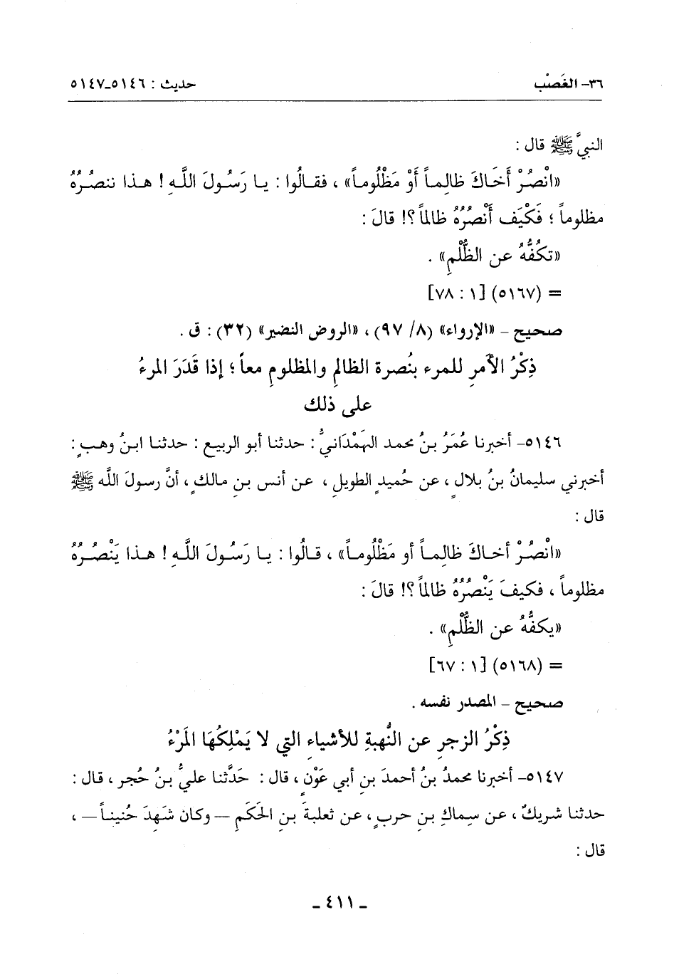 (انْصُرْ أَخَاكَ ظَالِمًا أَوْ مَظْلُومًا) قَالُوا: يَا رَسُولَ اللَّهِ هَذَا يَنْصُرُهُ مَظْلُومًا فَكَيْفَ يَنْصُرُهُ ظَالِمًا؟ قَالَ: