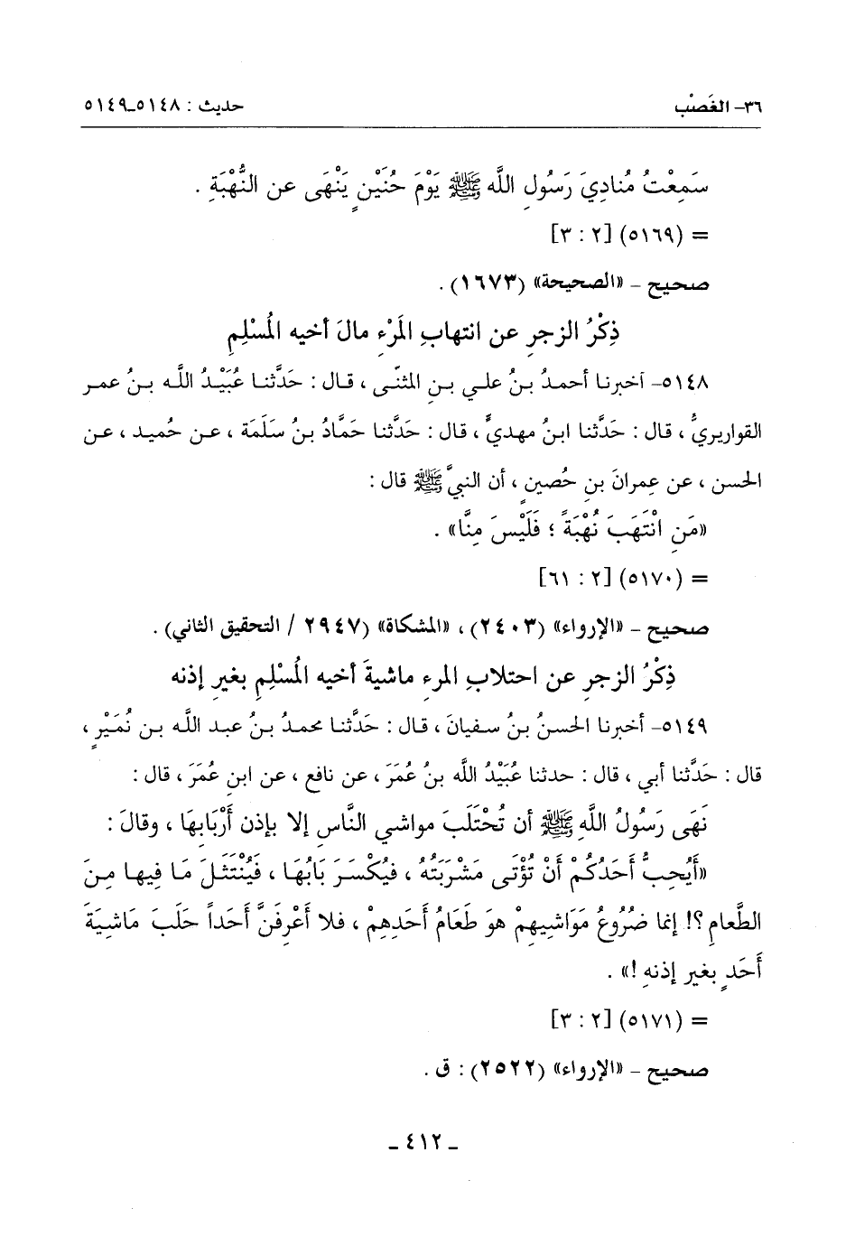 (أَيُحِبُّ أَحَدُكُمْ أَنْ تُؤْتَى مَشْرَبَتُهُ فيُكْسَرَ بَابُهَا فَيُنْتَثَلَ مَا فِيهَا مِنَ الطَّعَامِ إِنَّمَا ضُرُوعُ مَوَاشِيهِمْ هُوَ طَعَامُ أَحَدِهِمْ فَلَا أعرفنَّ أَحَدًا حلب ماشية أحد بغير إذنه)