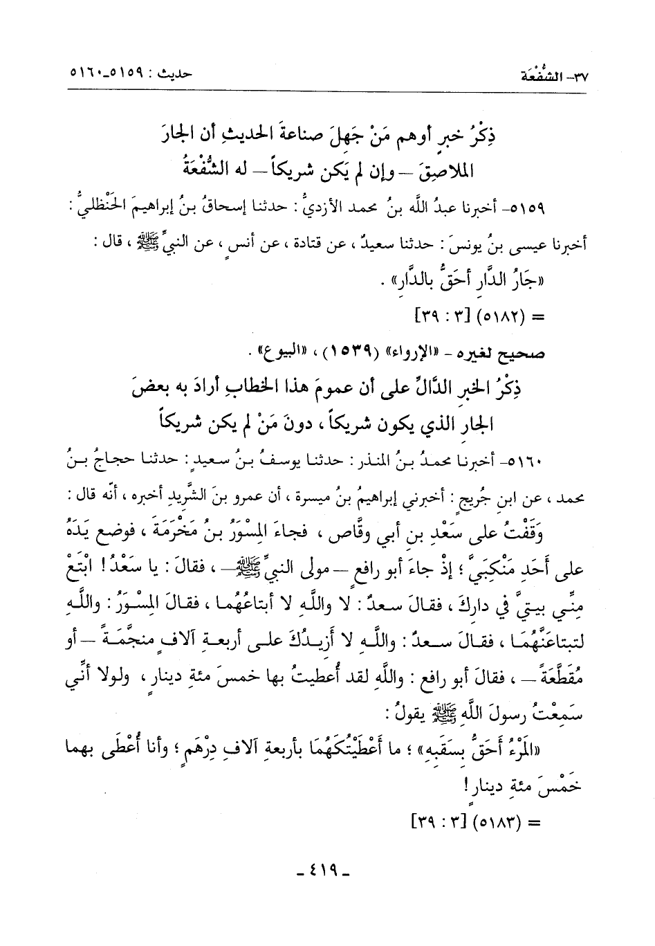 ذِكْرُ خَبَرٍ أَوْهَمَ مَنْ جَهِلَ صِنَاعَةَ الْحَدِيثِ أَنَّ الْجَارَ الْمُلَاصِقَ ـ وَإِنْ لَمْ يَكُنْ شَرِيكًا ـ له الشفعة