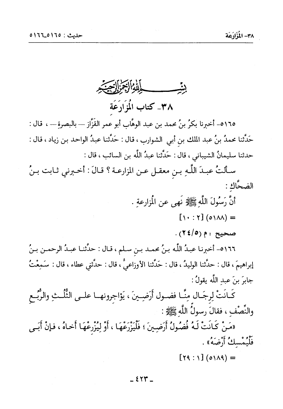 5165 - أَخْبَرَنَا بَكْرُ بْنُ مُحَمَّدِ بْنِ عَبْدِ الْوَهَّابِ أَبُو عُمَرَ الْقَزَّازُ بِالْبَصْرَةِ قَالَ: حَدَّثَنَا مُحَمَّدُ بْنُ عَبْدِ الْمَلِكِ بْنِ أَبِي الشَّوَارِبِ قَالَ: حَدَّثَنَا عَبْدُ الْوَاحِدِ بْنُ زِيَادٍ قَالَ: حَدَّثَنَا سُلَيْمَانُ الشَّيْبَانِيُّ قَالَ: حَدَّثَنَا عَبْدُ اللَّهِ بْنُ السَّائِبِ قَالَ: